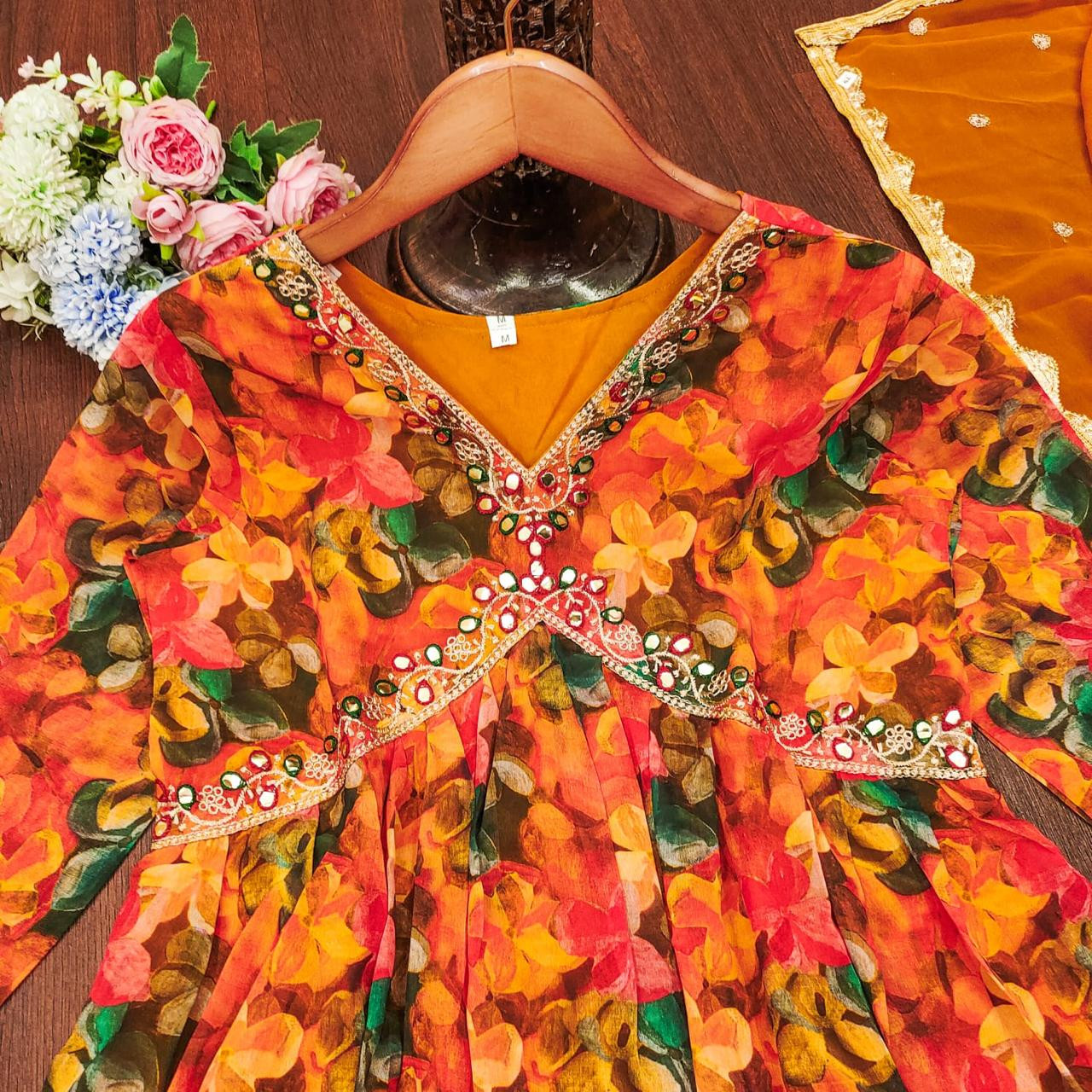 Fabric Fox Georgette with digital print gown With mirror work frill with mirror work Dupptta with print pent