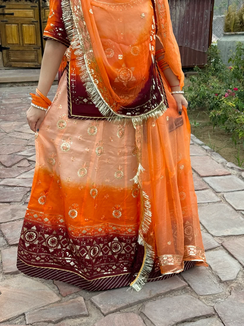 Introducing our "Vibrant Three-Color Orange Upada Poshak," a stunning fusion of tradition and modernity. Crafted from the finest Upada silk, this poshak exudes elegance and luxury, making it a perfect choice for festive occasions and celebrations. The poshak features a mesmerizing blend of three vibrant shades of orange, seamlessly transitioning from one hue to another, creating a dynamic and eye-catching effect.