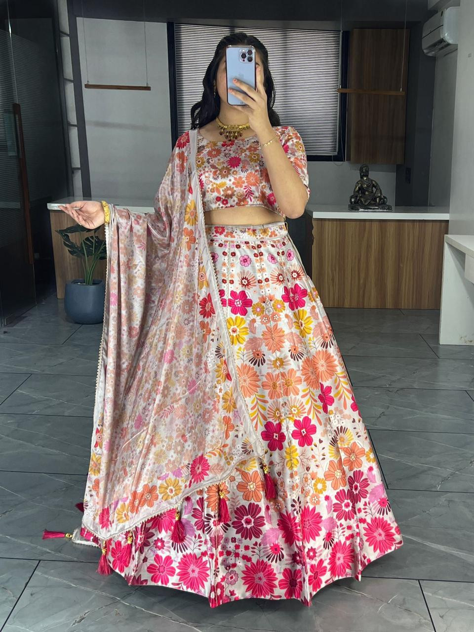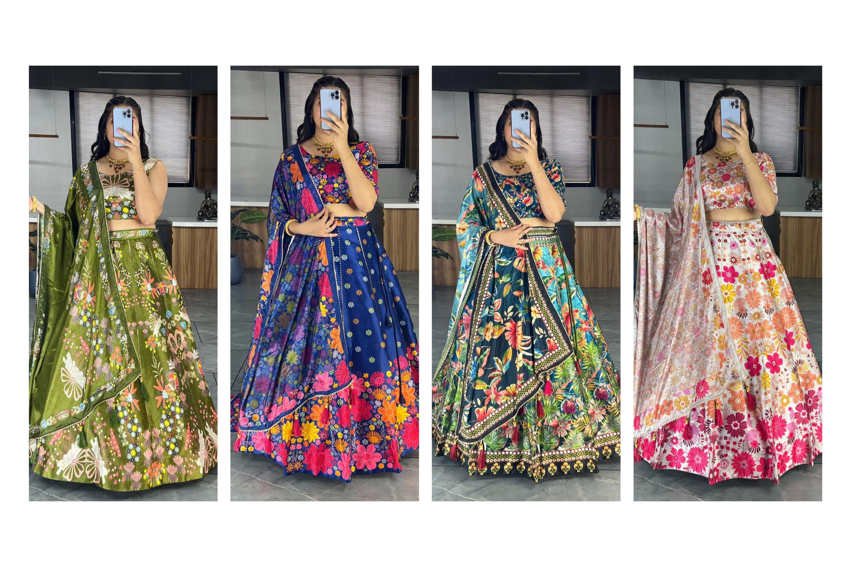 Step into a world where tradition meets contemporary charm with our latest exclusive printed lehenga creation, crafted from a harmonious blend of floral and geometric patterns. This vibrant ensemble captures the essence of femininity, combining soft floral motifs with bold geometric accents to create a look that's both timeless and modern.