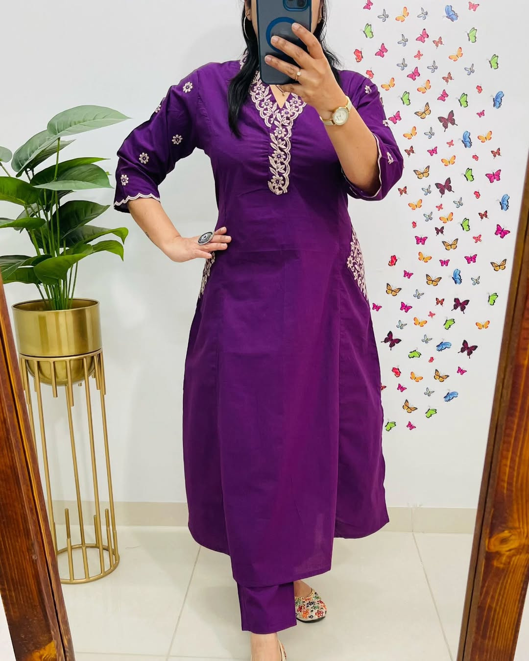 Designer Top Pant set in Fine Cotton With Heavy thread Embroidery work on the yoke & Both side Pockets...