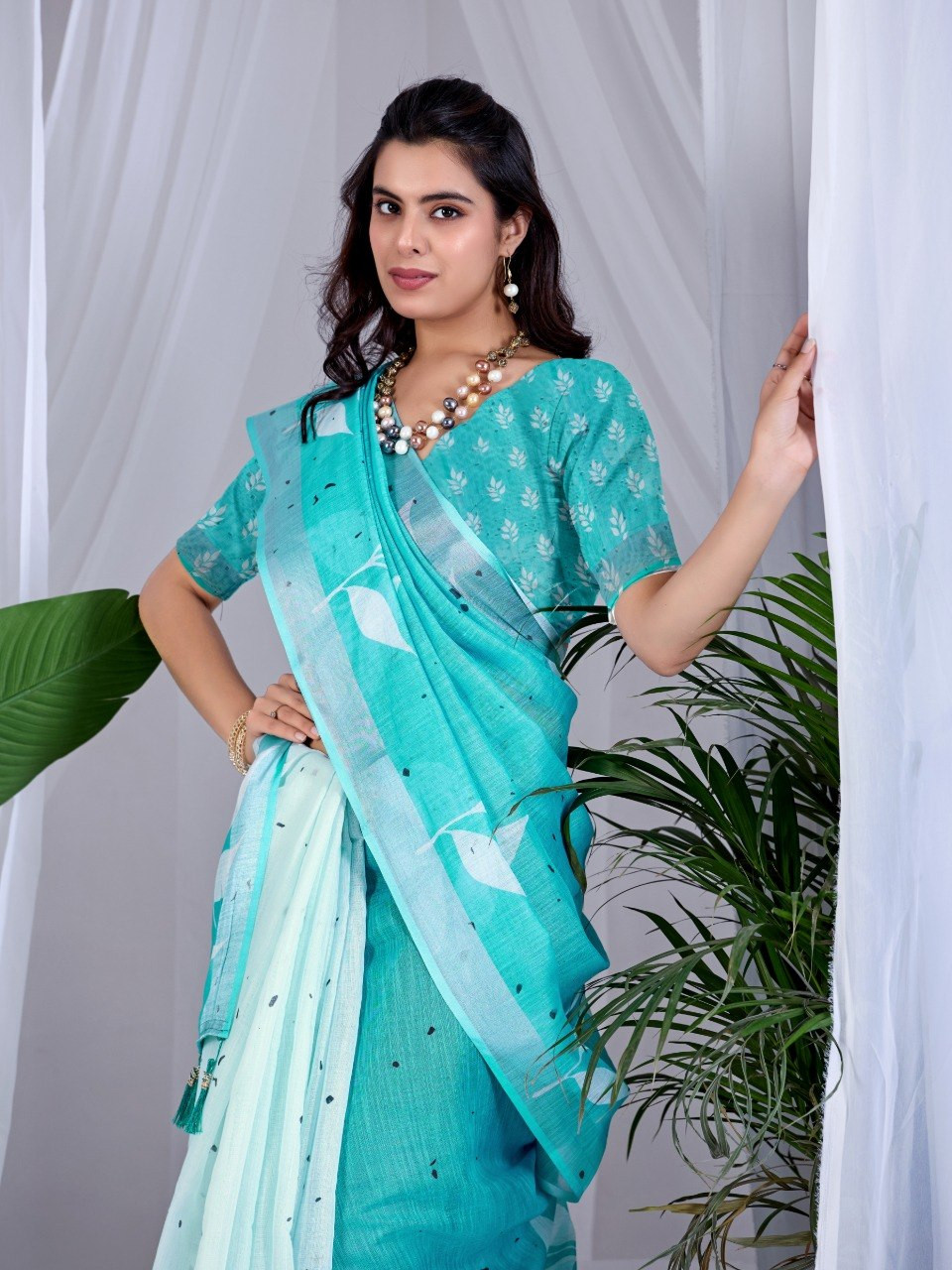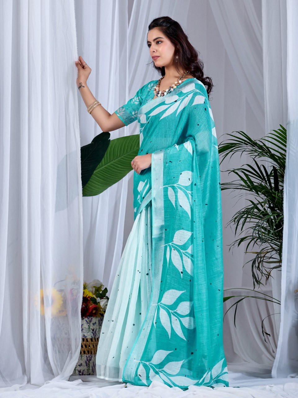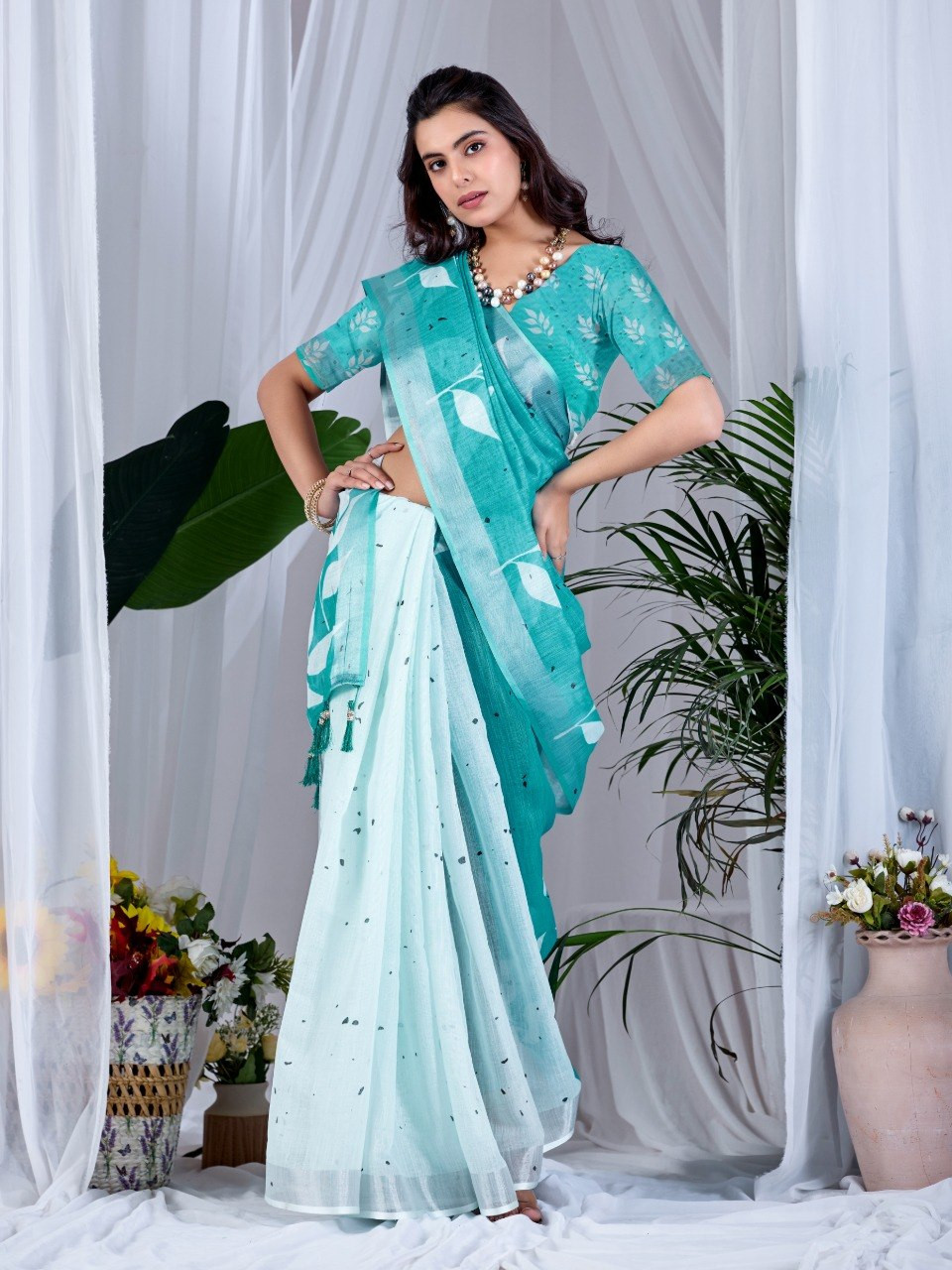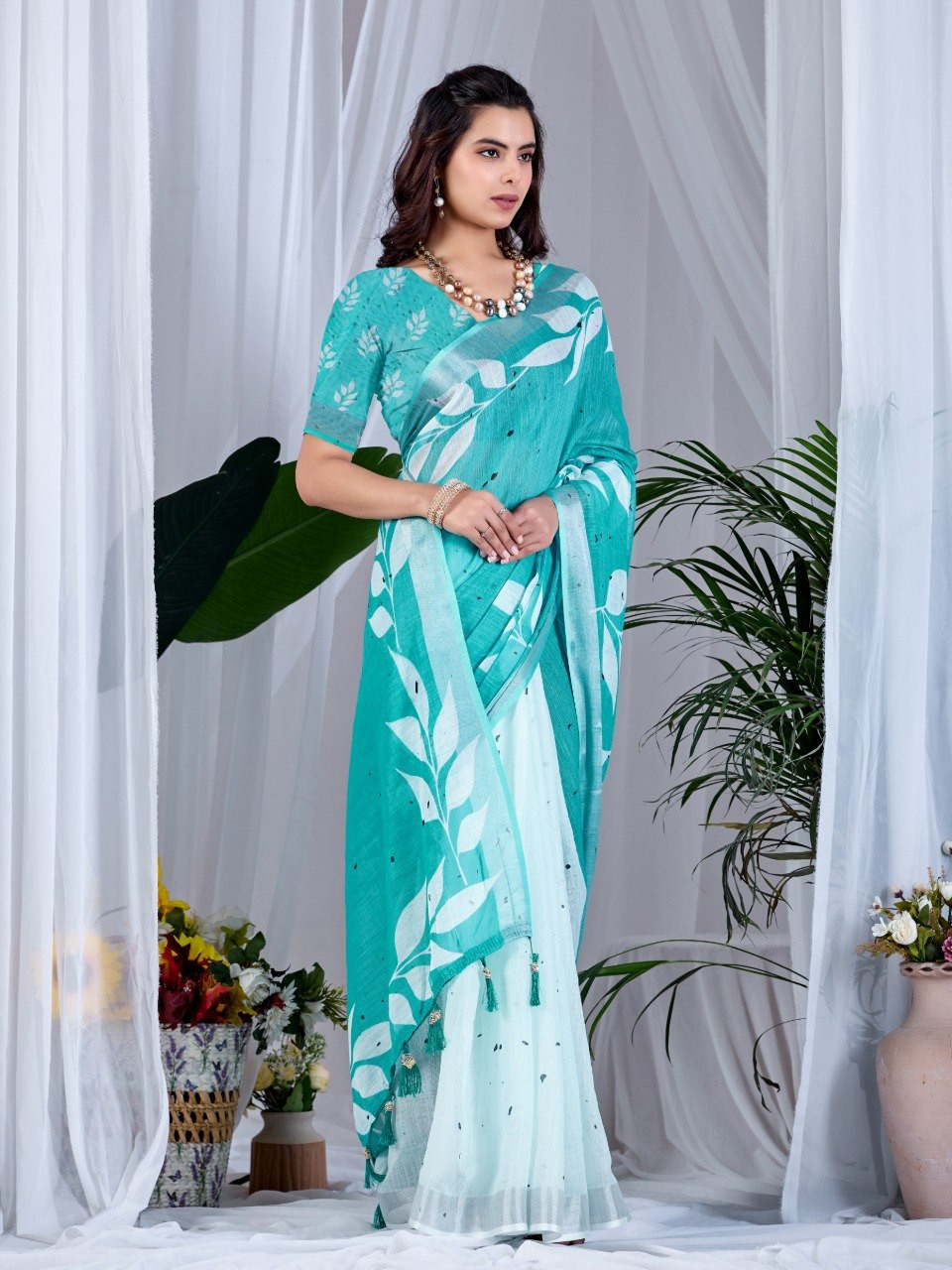 Upgrade your wardrobe with this elegant soft linen cotton saree, designed to offer both comfort and style. Featuring a refreshing aqua green base adorned with beautiful allover leafy digital prints, this saree brings a soothing and nature-inspired charm to your look. The graceful contrast pallu enhances its overall appeal, making it perfect for casual outings, office wear, or daytime events.