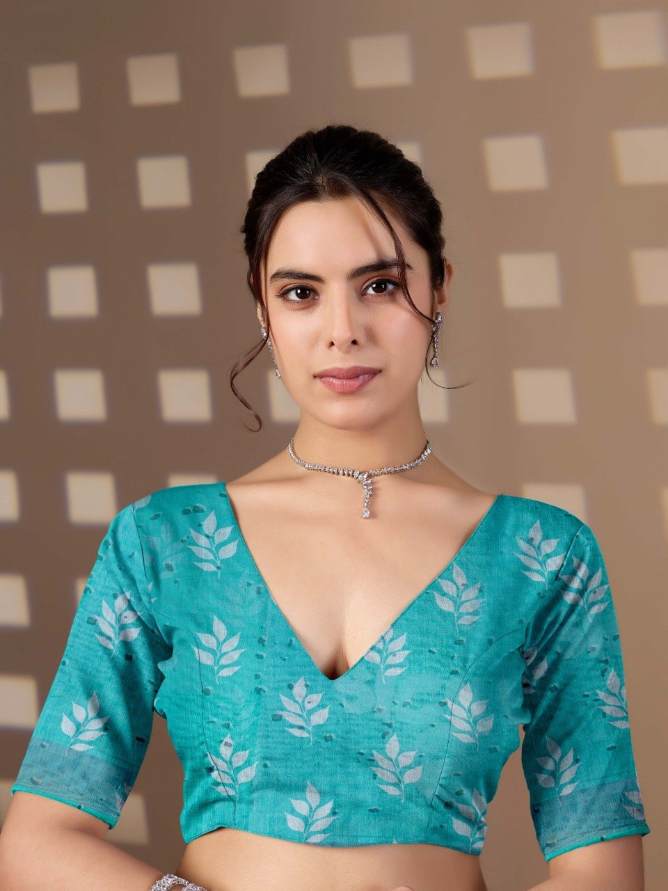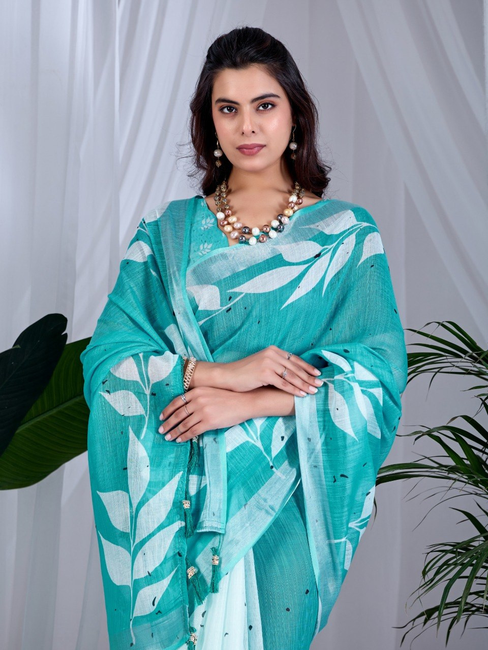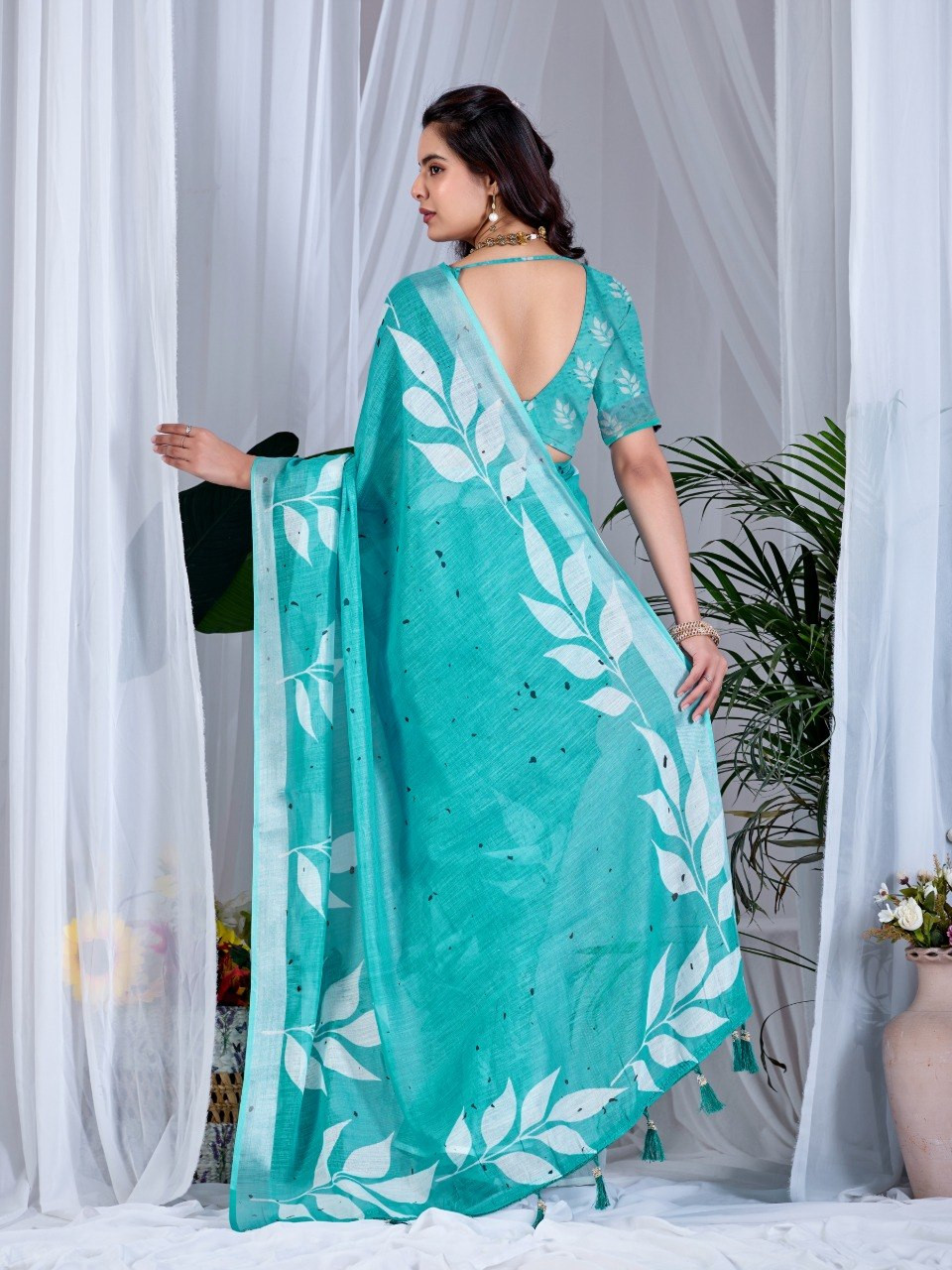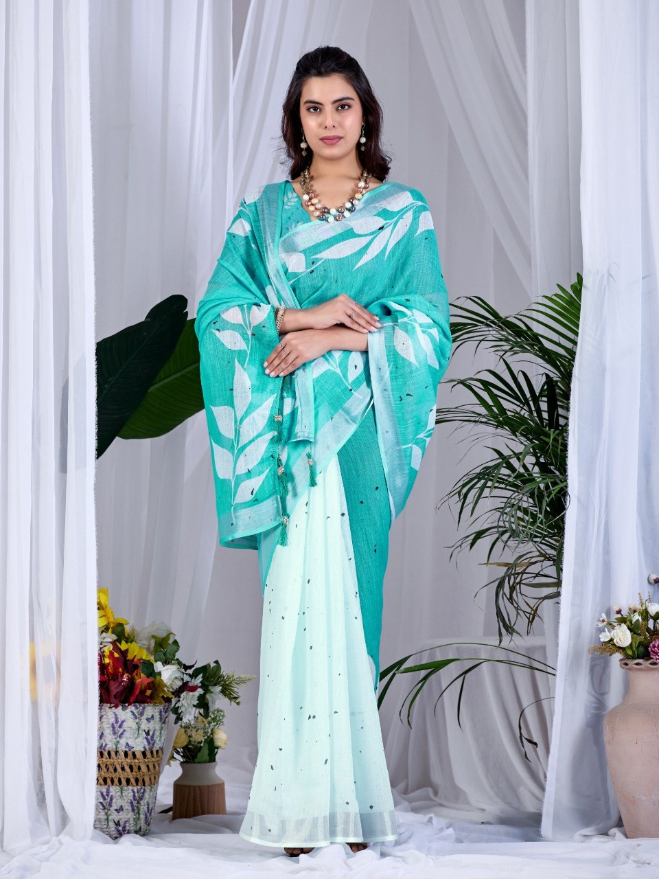 Upgrade your wardrobe with this elegant soft linen cotton saree, designed to offer both comfort and style. Featuring a refreshing aqua green base adorned with beautiful allover leafy digital prints, this saree brings a soothing and nature-inspired charm to your look. The graceful contrast pallu enhances its overall appeal, making it perfect for casual outings, office wear, or daytime events.