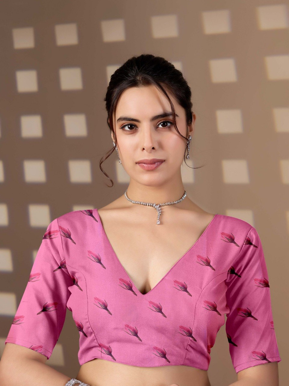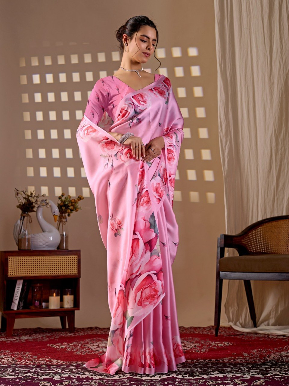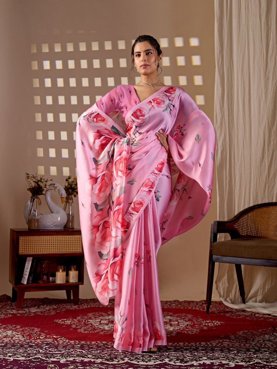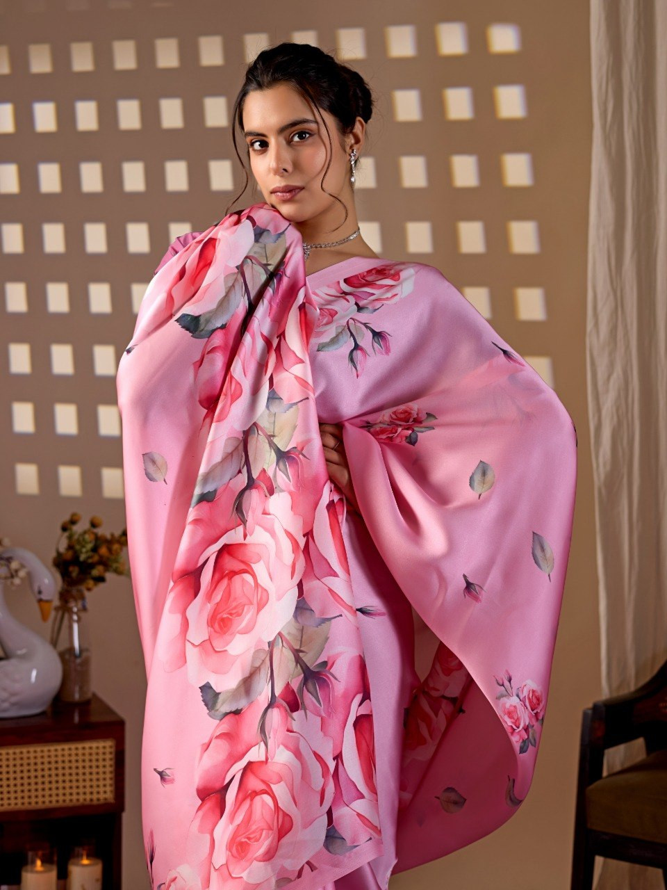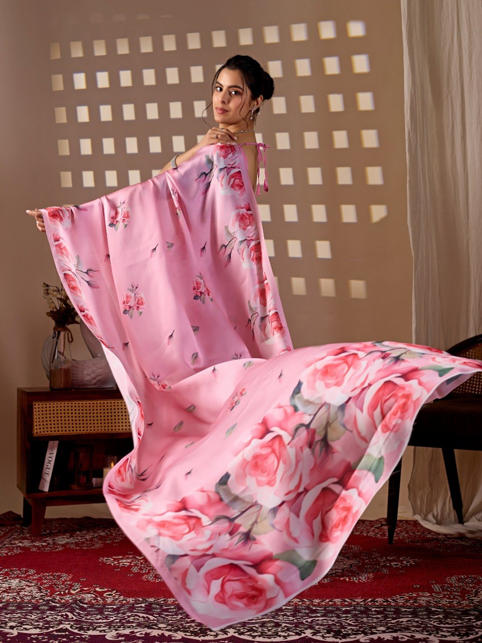 Add a touch of elegance to your wardrobe with this beautiful satin georgette saree. Designed in a soft baby pink shade, this saree features a stunning allover rose floral digital print that gives a graceful and charming appeal. The lightweight and flowy fabric ensures comfort while maintaining a stylish drape, making it perfect for casual outings, festive occasions, and daily wear.