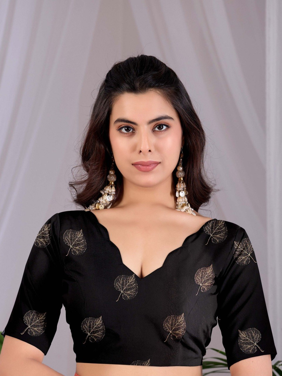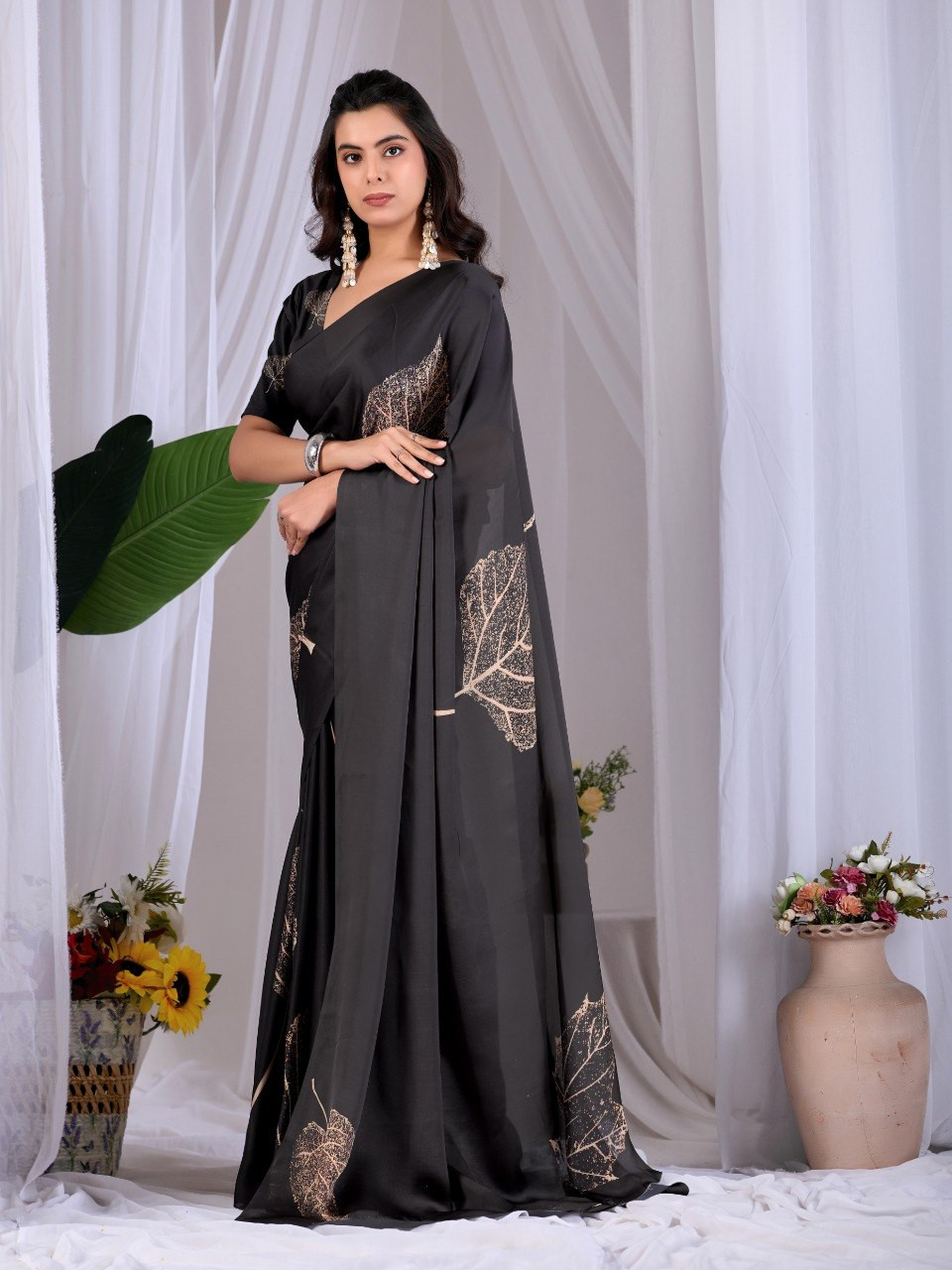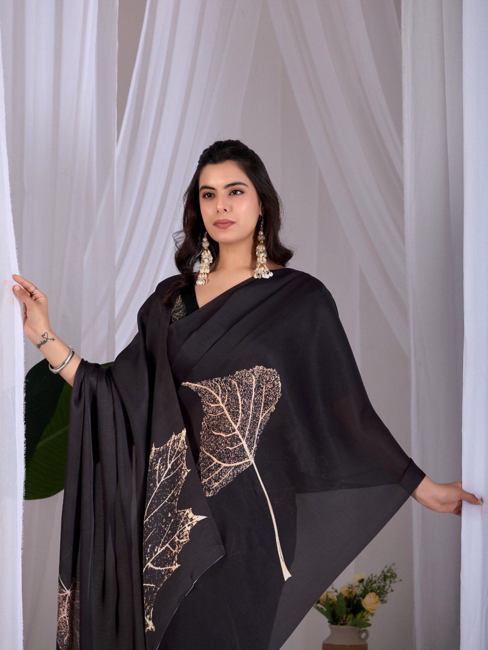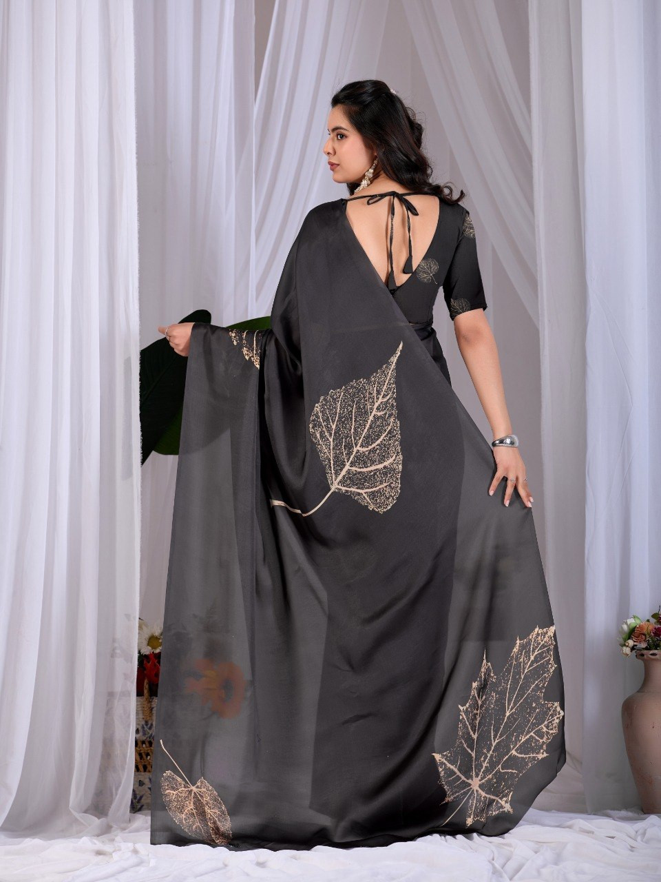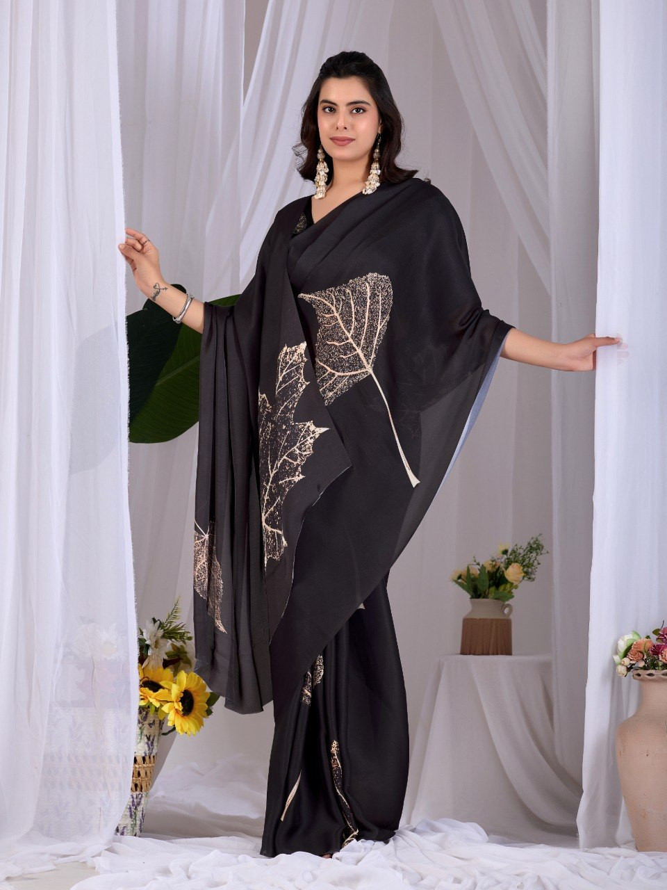 Upgrade your wardrobe with this stunning black satin georgette saree that perfectly blends elegance with modern charm. Designed in a timeless black shade, this saree is beautifully enhanced with subtle golden leaf digital prints that add a touch of luxury and sophistication.