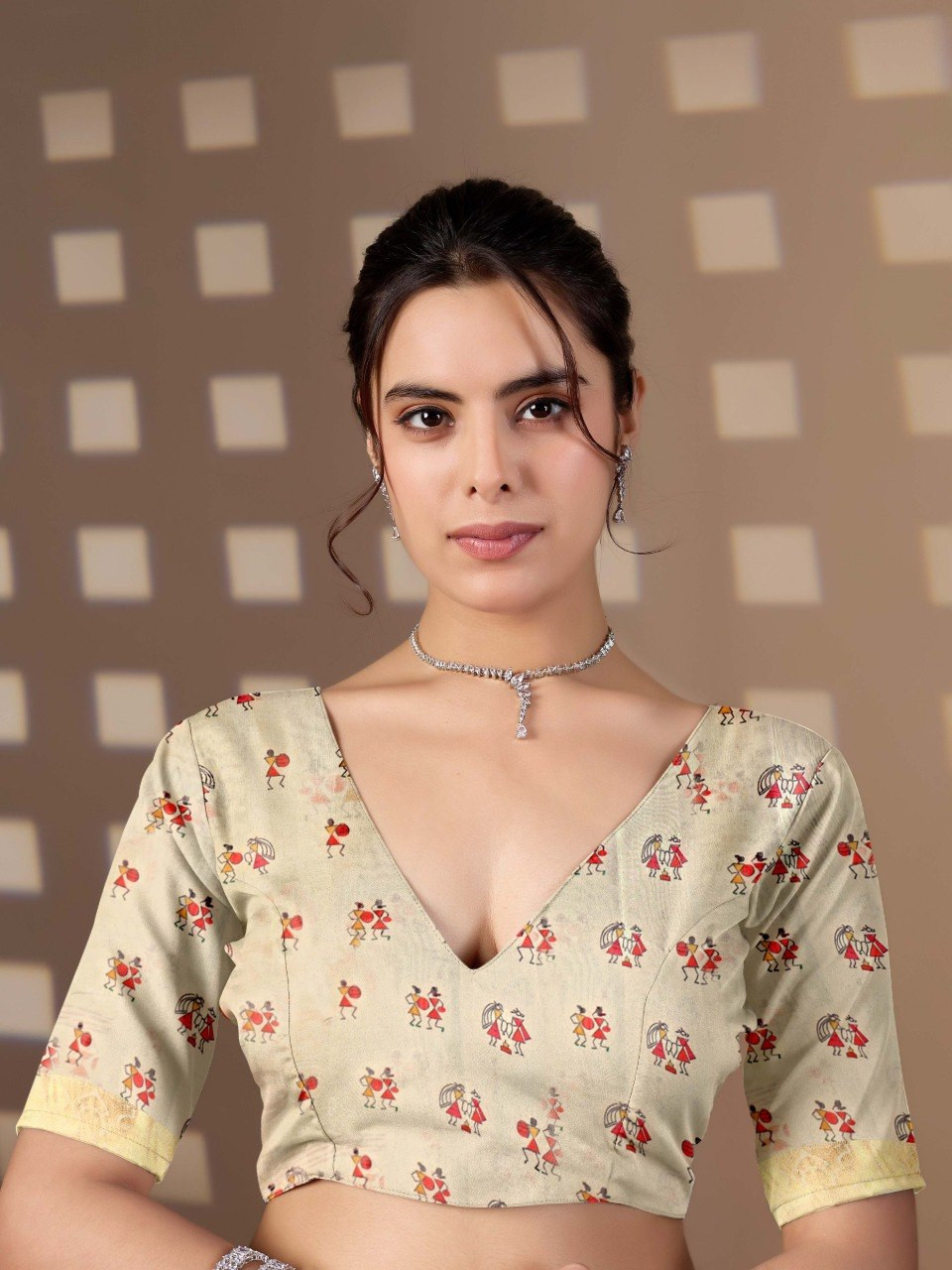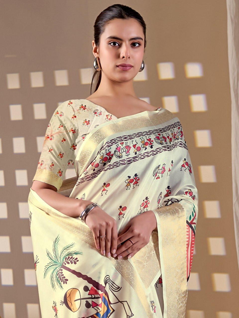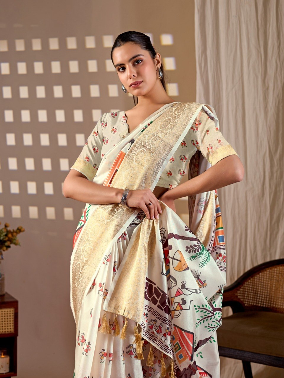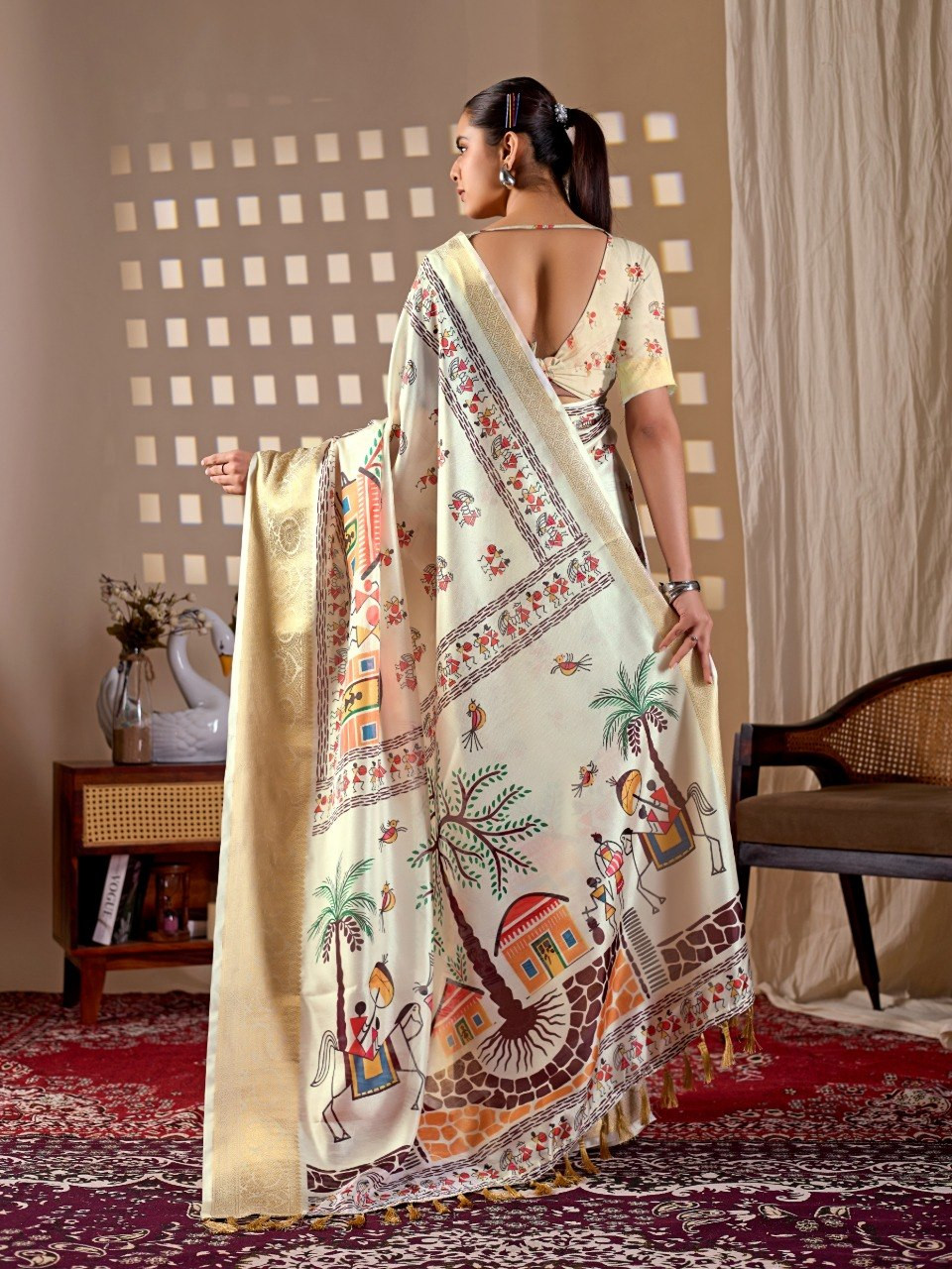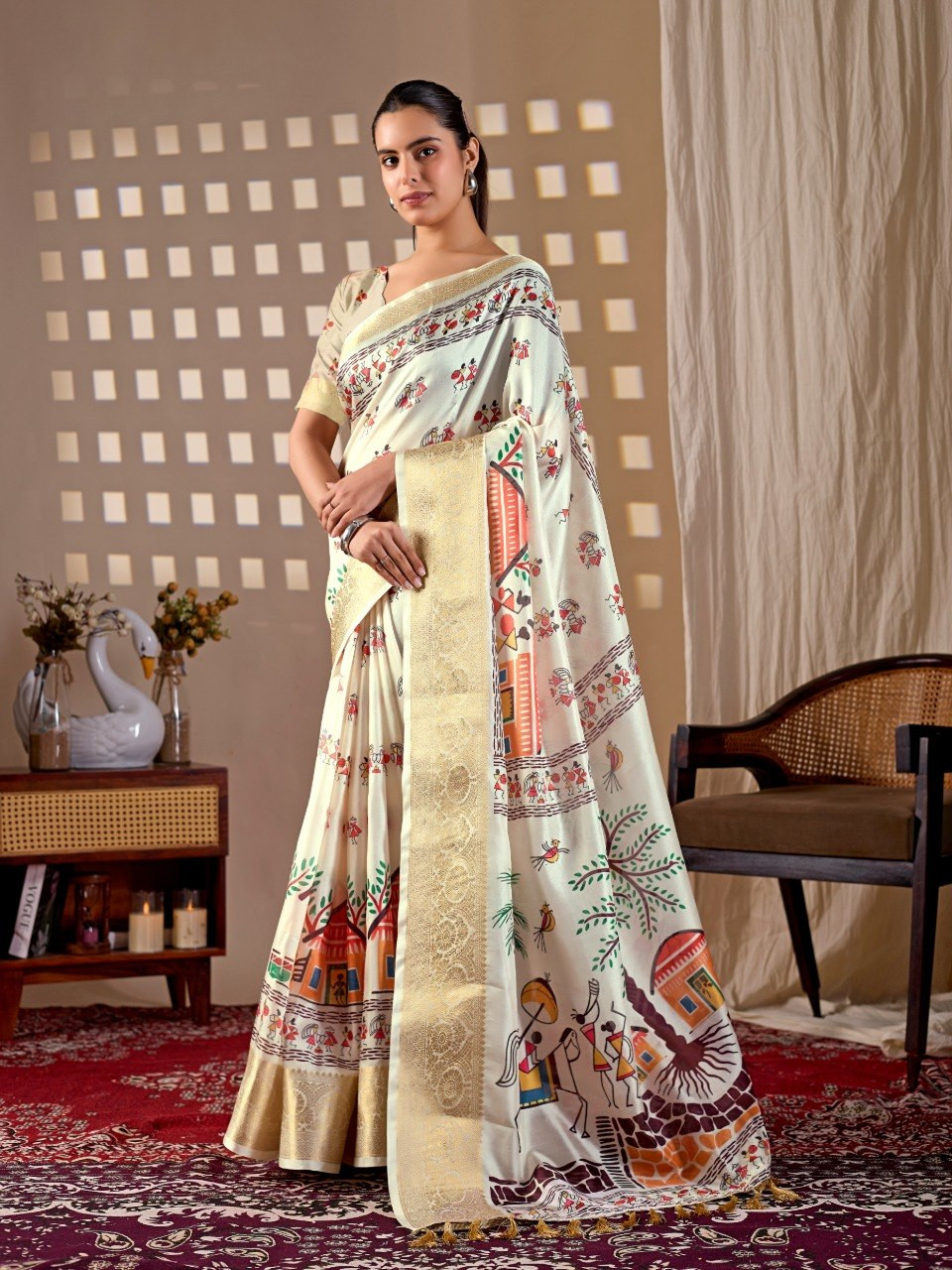 Upgrade your ethnic wardrobe with this beautifully crafted soft Lichi silk saree, designed to offer both elegance and comfort. The saree features a soothing cream base adorned with traditional village art prints, giving it a timeless and cultural appeal. The rich woven border enhances its premium look, making it perfect for festive occasions, casual gatherings, and cultural events.