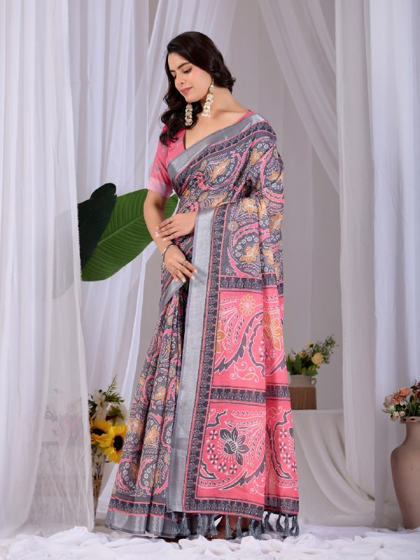 Upgrade your ethnic wardrobe with this elegant soft linen cotton saree, beautifully designed with allover floral and paisley digital prints in a stylish grey and pink combination. The graceful contrast border enhances its classy appeal, making it perfect for casual outings, office wear, and festive occasions. Crafted for comfort and style, this saree offers a soft texture and easy drape for all-day wear.