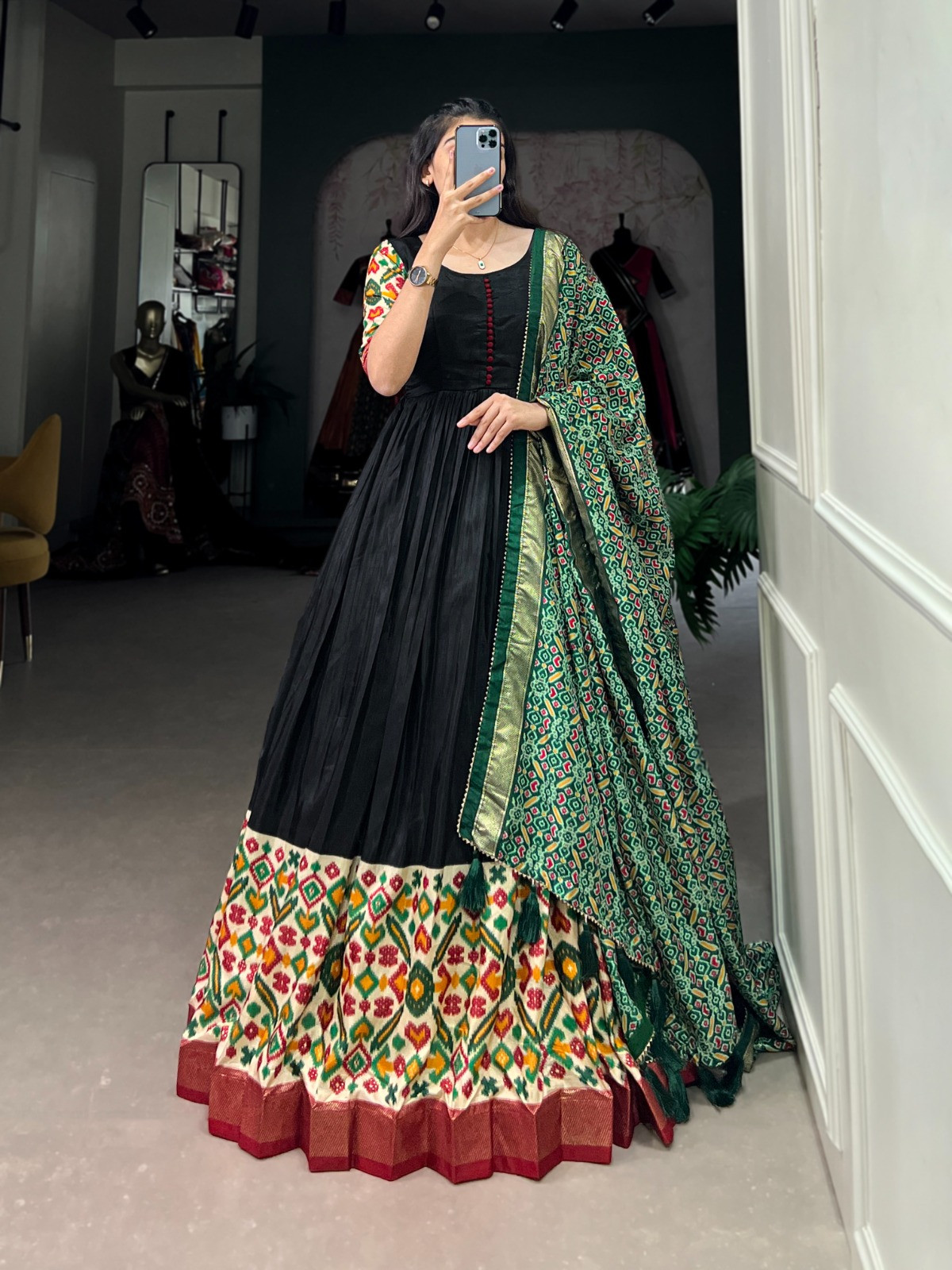 It sounds like this outfit is designed to be an absolute showstopper for any occasion, with the perfect mix of traditional and modern elements! Whether it’s a wedding, festival, or upscale event, this gown will definitely make the wearer stand out. Would you like suggestions on how to accessorize or wear it for specific occasions?
