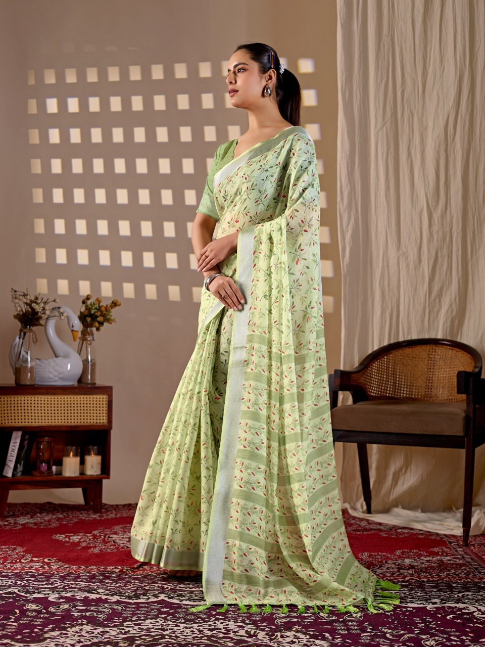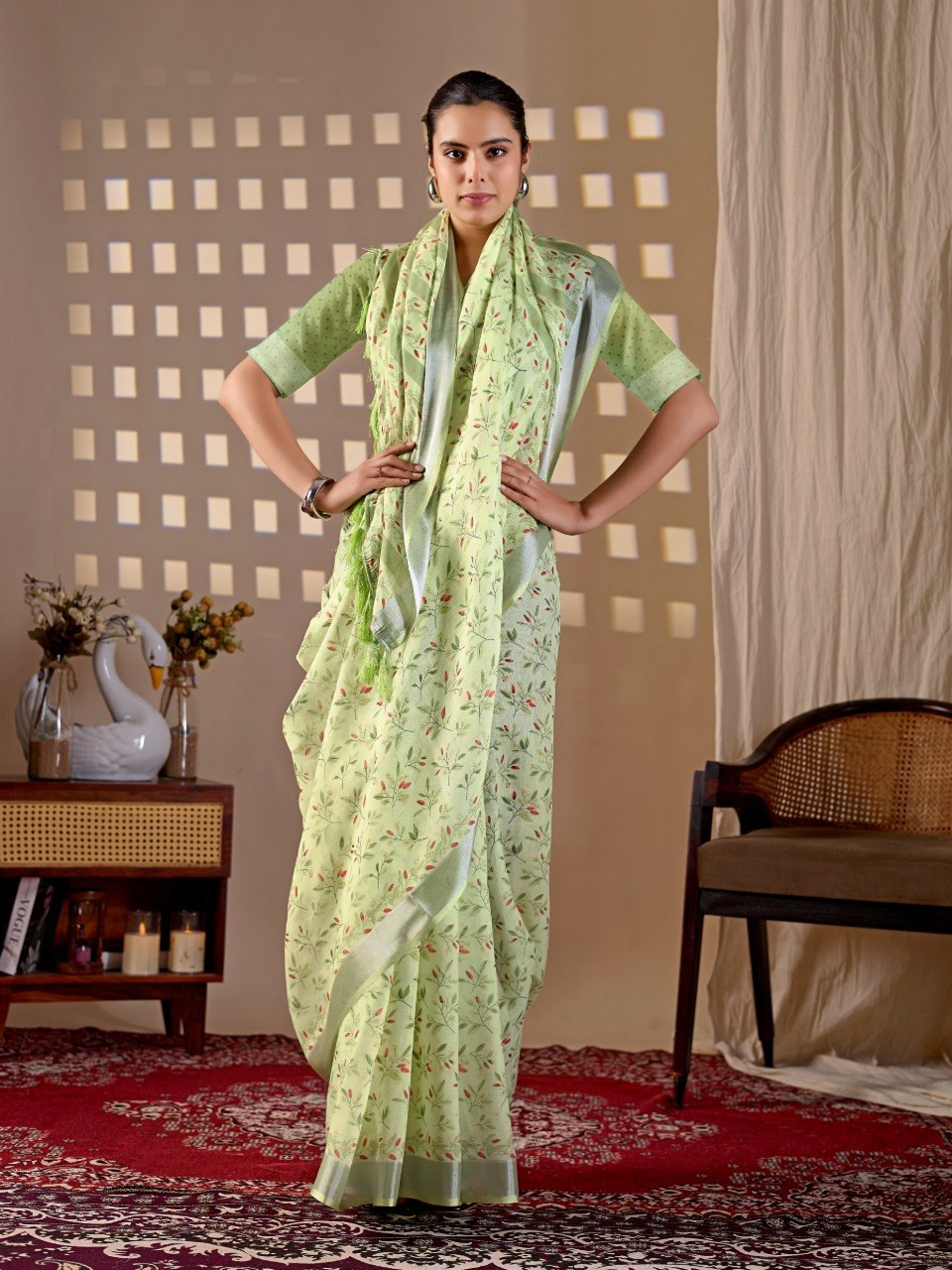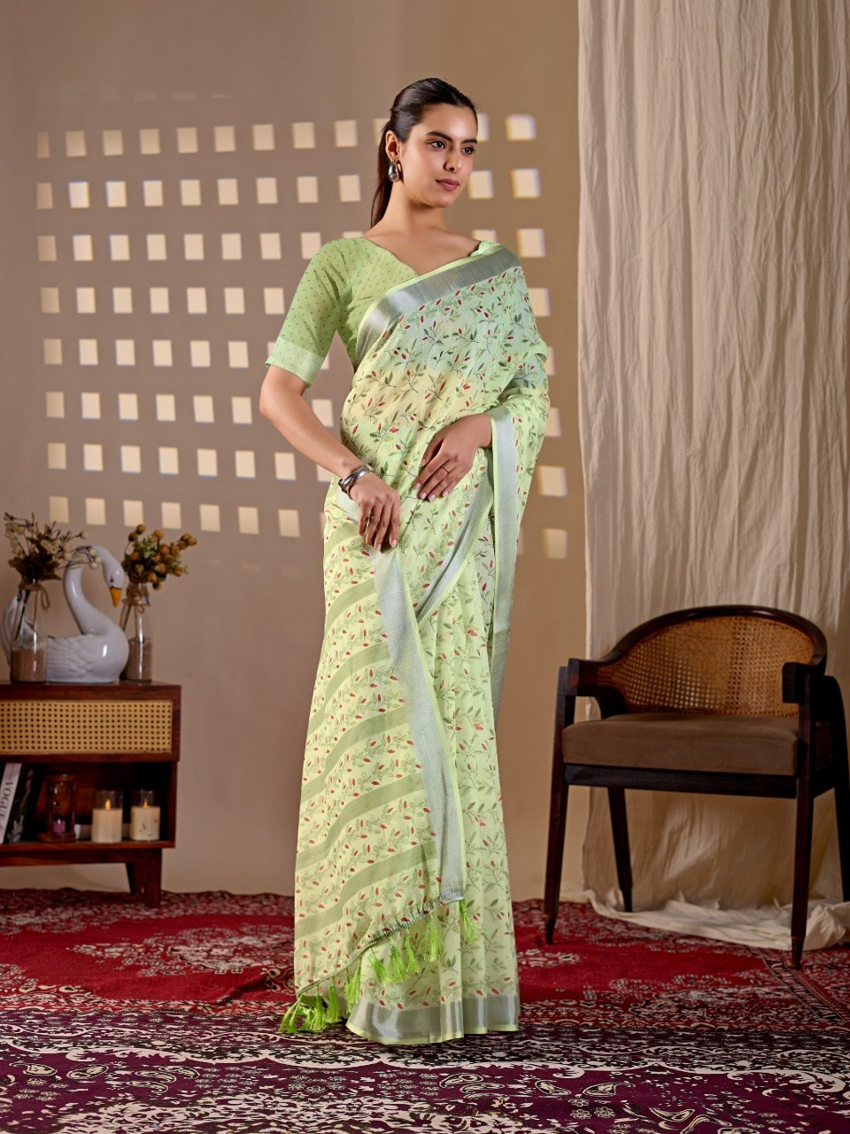 Enhance your ethnic wardrobe with this elegant soft linen cotton saree, beautifully designed with allover floral digital prints in a soothing pastel green tone. The refreshing color palette adds a calm and graceful charm, making it perfect for daily wear, office attire, and casual gatherings. The saree is complemented by a stylish contrast border that enhances its overall appeal and gives it a classy finish.