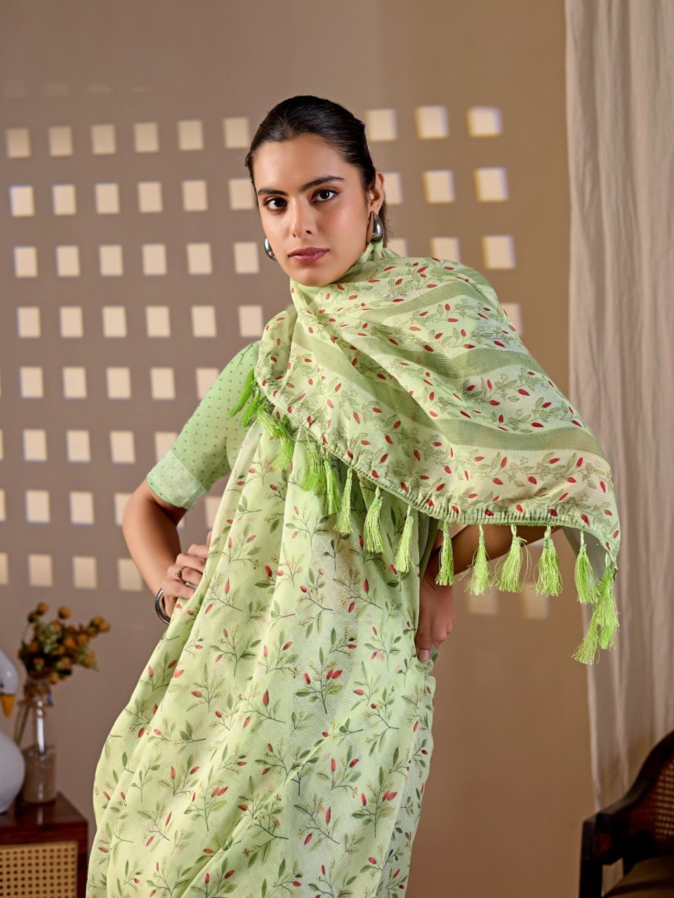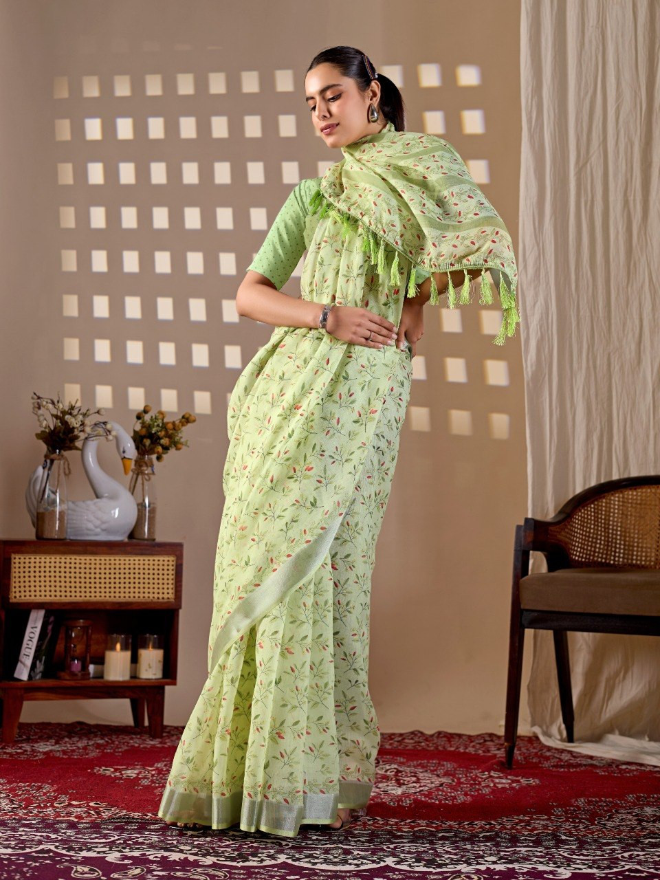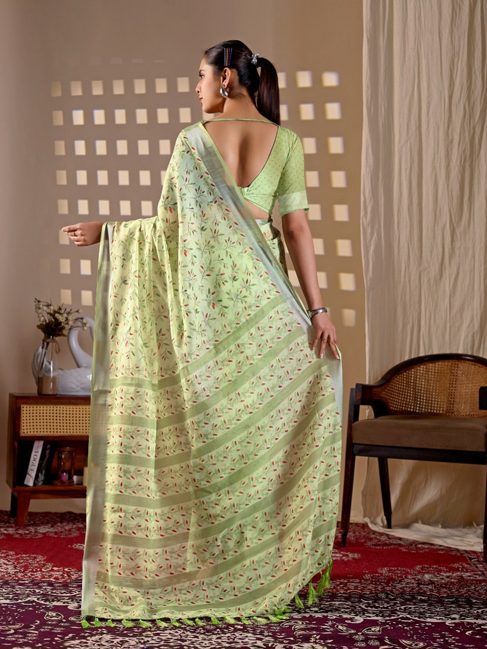 Enhance your ethnic wardrobe with this elegant soft linen cotton saree, beautifully designed with allover floral digital prints in a soothing pastel green tone. The refreshing color palette adds a calm and graceful charm, making it perfect for daily wear, office attire, and casual gatherings. The saree is complemented by a stylish contrast border that enhances its overall appeal and gives it a classy finish.