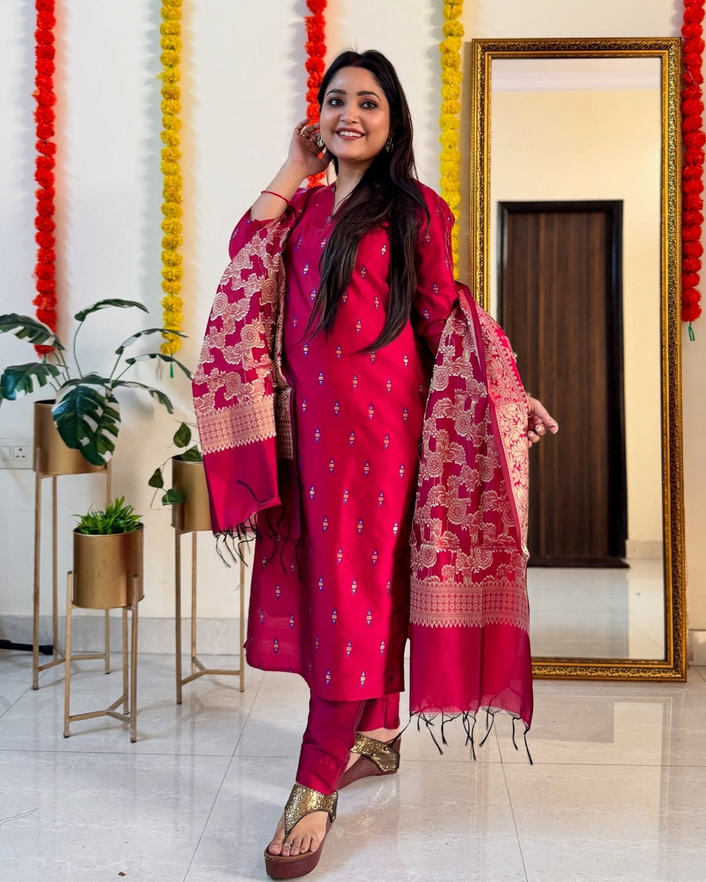 Step into elegance with this Women’s Kurta Pant Dupatta Set, crafted in premium jacquard fabric. The beautifully woven pink kurta features intricate weaving work, a graceful 44-inch length, and stylish 3/4 sleeves for a refined ethnic look.