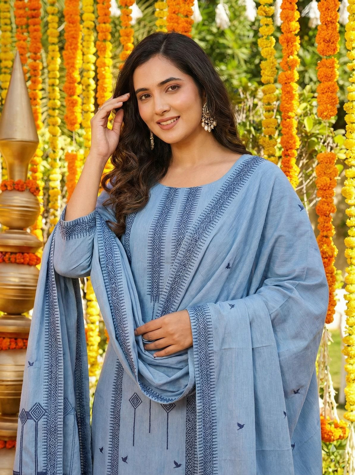 Upgrade your ethnic wardrobe with this graceful sky blue kurta set crafted from 100% pure cotton, offering unmatched comfort and breathability. The kurta features intricate jacquard work that adds a touch of sophistication, complemented by a classic round neck and elegant full sleeves for a refined look.