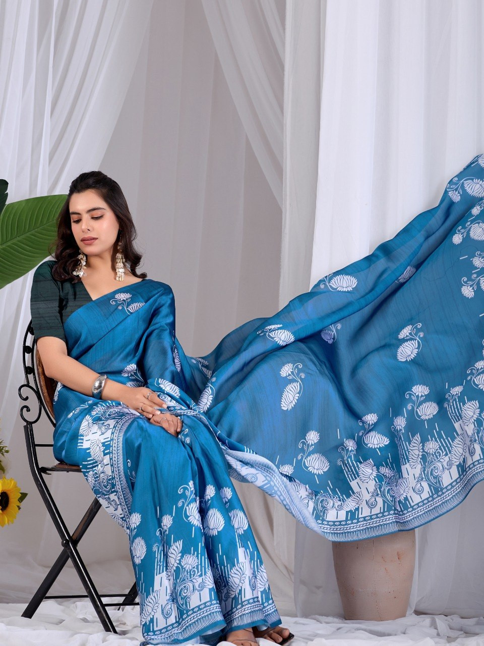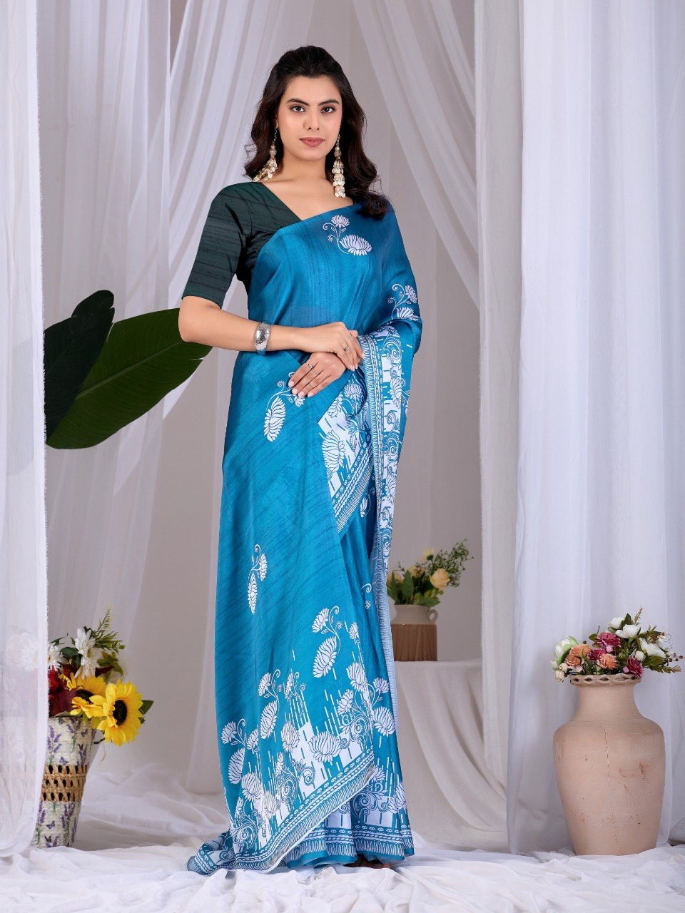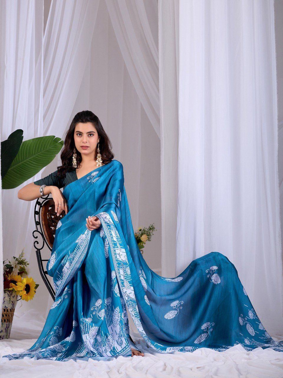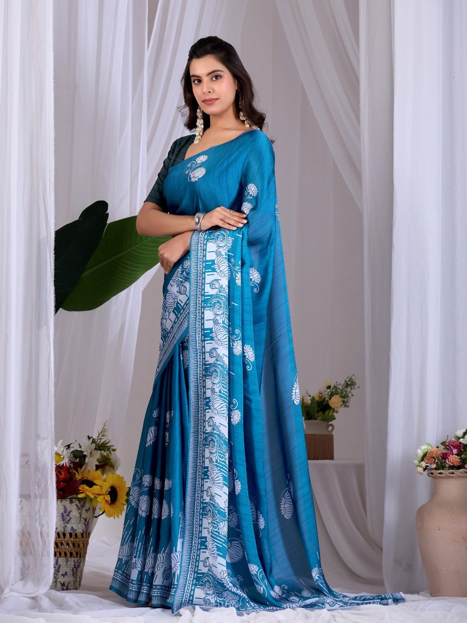 Upgrade your ethnic wardrobe with this elegant satin georgette saree in a rich teal blue shade, beautifully adorned with intricate white traditional floral digital prints. The soft and lightweight fabric offers a smooth drape, making it perfect for festive occasions, parties, and daily elegance.