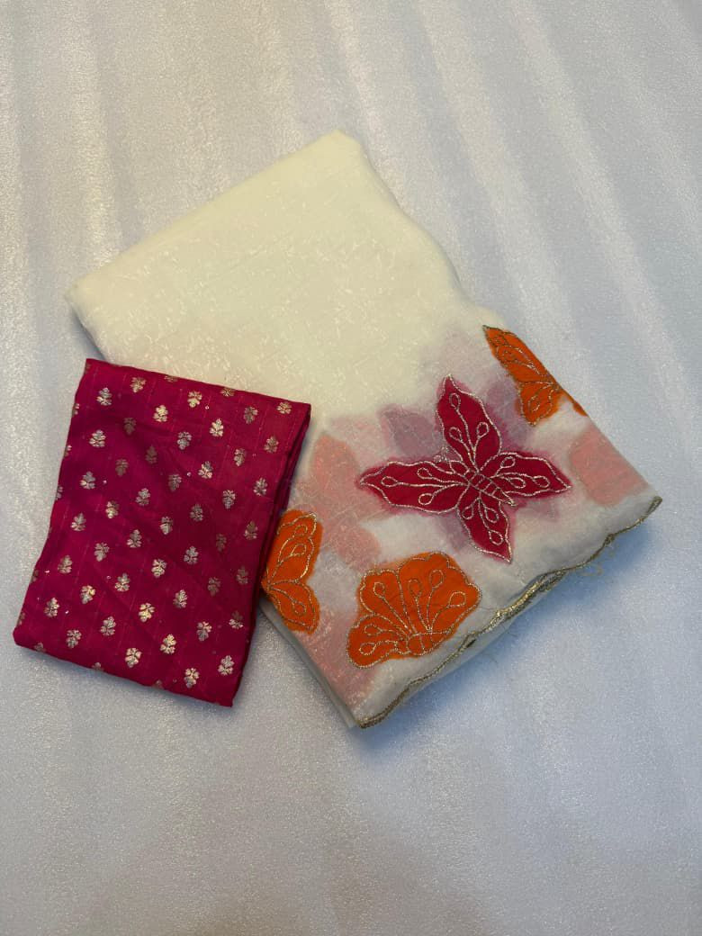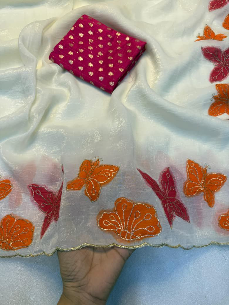 Add a touch of elegance and charm to your wardrobe with this Elegant White Butterfly Saree, crafted in a soft organza / tissue silk look fabric that feels light and graceful. The saree features a beautifully detailed colorful butterfly embroidery border in pink and orange, creating a fresh and trendy appeal.