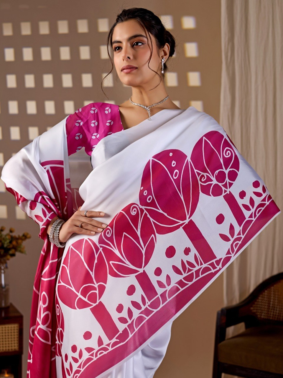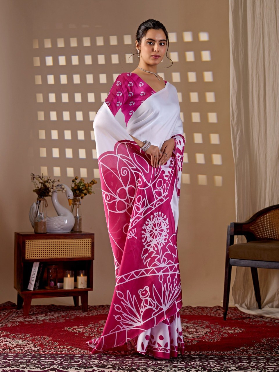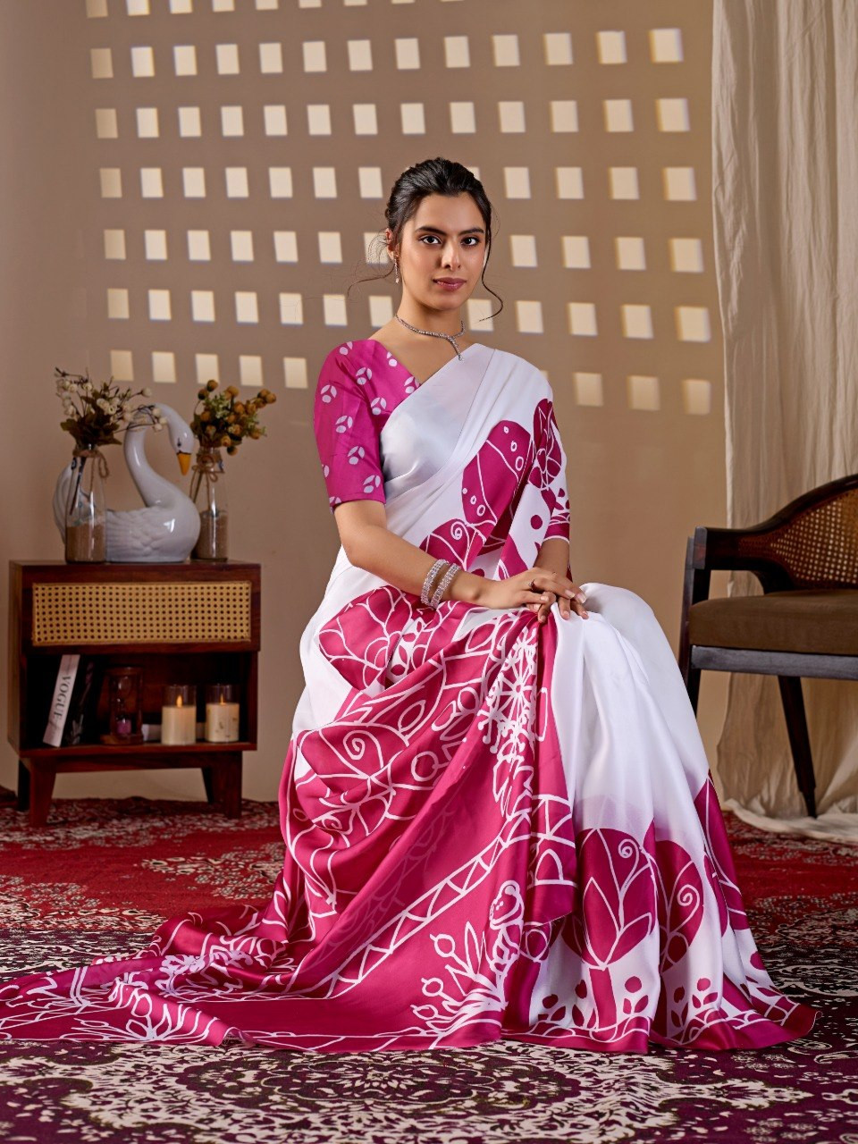 Upgrade your ethnic wardrobe with this elegant soft satin georgette saree, designed to offer a perfect blend of grace and modern charm. Featuring a beautiful combination of artistic floral and abstract digital prints in a classy white and rani pink palette, this saree gives a fresh, stylish, and eye-catching appeal.