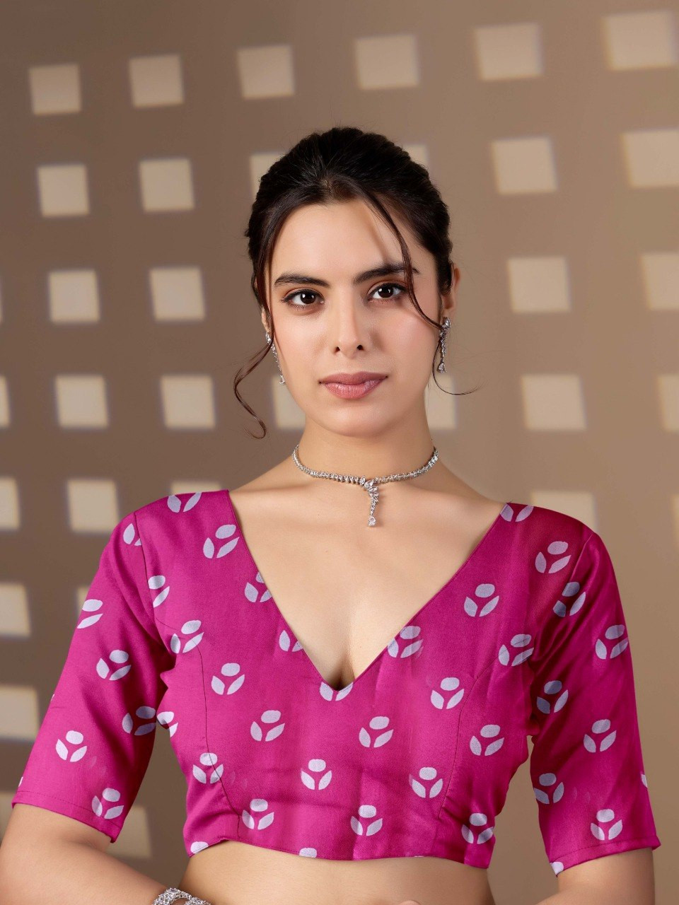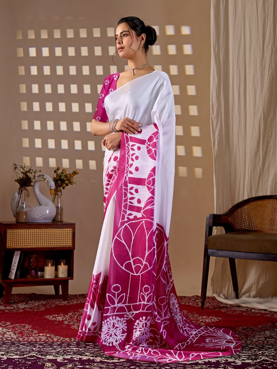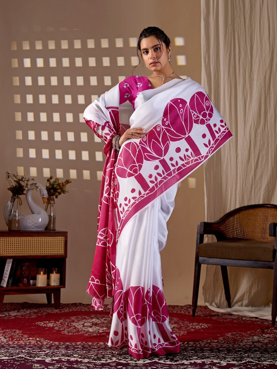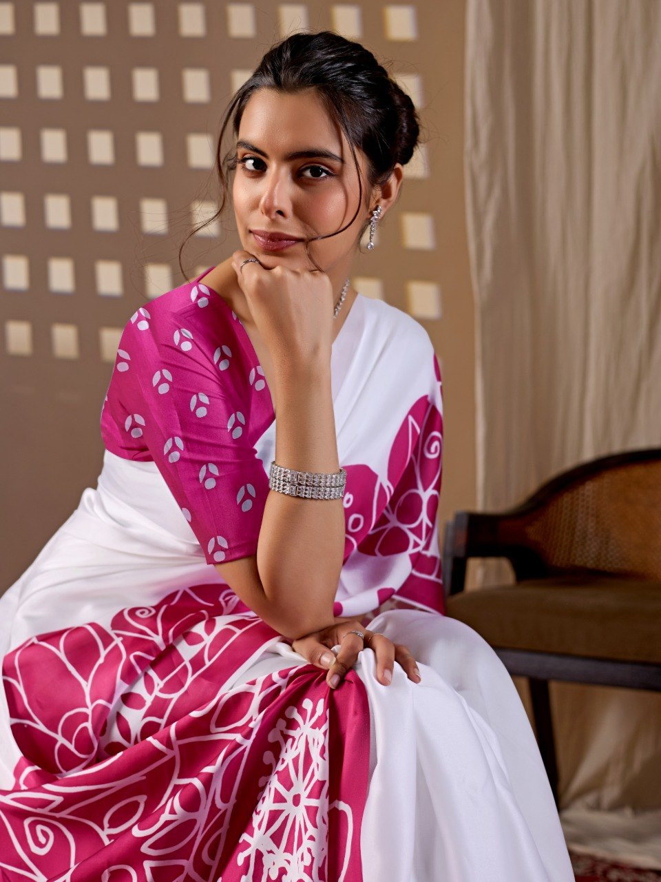 Upgrade your ethnic wardrobe with this elegant soft satin georgette saree, designed to offer a perfect blend of grace and modern charm. Featuring a beautiful combination of artistic floral and abstract digital prints in a classy white and rani pink palette, this saree gives a fresh, stylish, and eye-catching appeal.