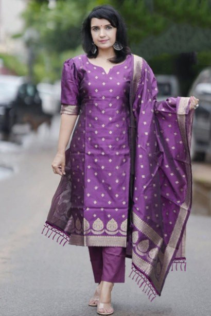 Upgrade your ethnic wardrobe with this Women’s Kurta Pant Dupatta Set in a stunning purple shade.