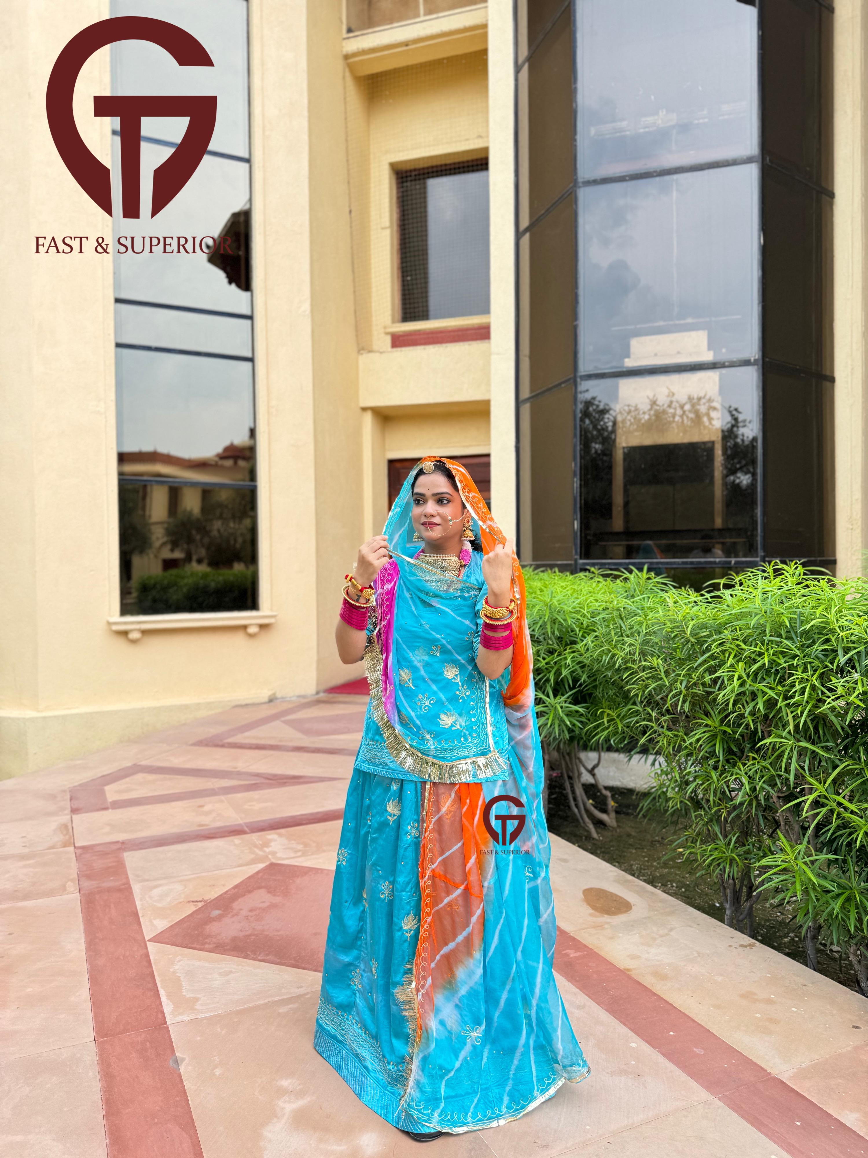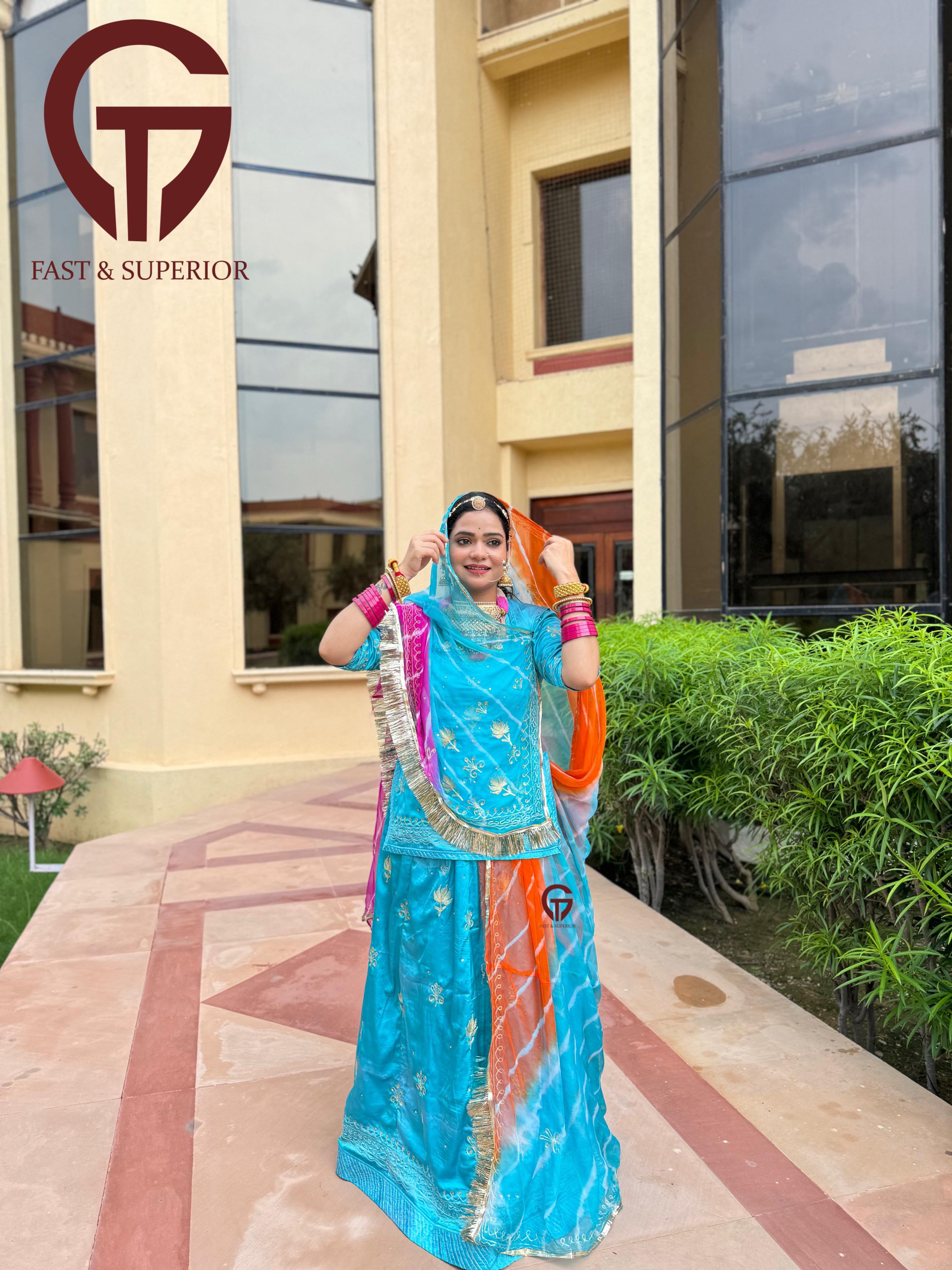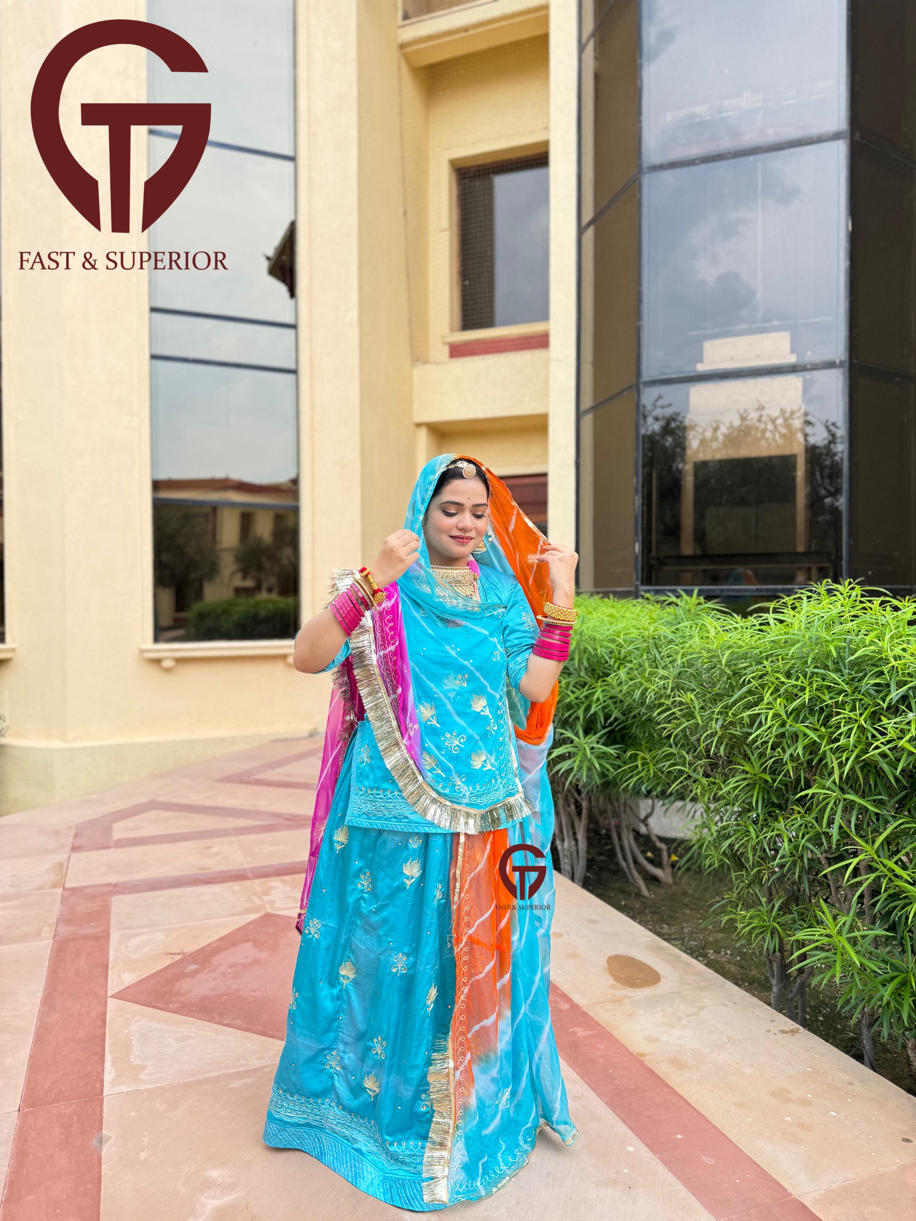 It looks like you're interested in a "satan" or satin partywear Rajputi poshak. Satin can add a luxurious touch to the traditional attire, making it perfect for festive occasions and celebrations.