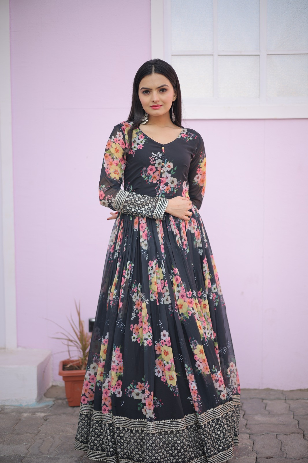 Fabric & Work: Crafted from Digital Printed Faux Georgette, this gown features exquisite Zari and Sequins Embroidery Work, adding just the right amount of shimmer and tradition.