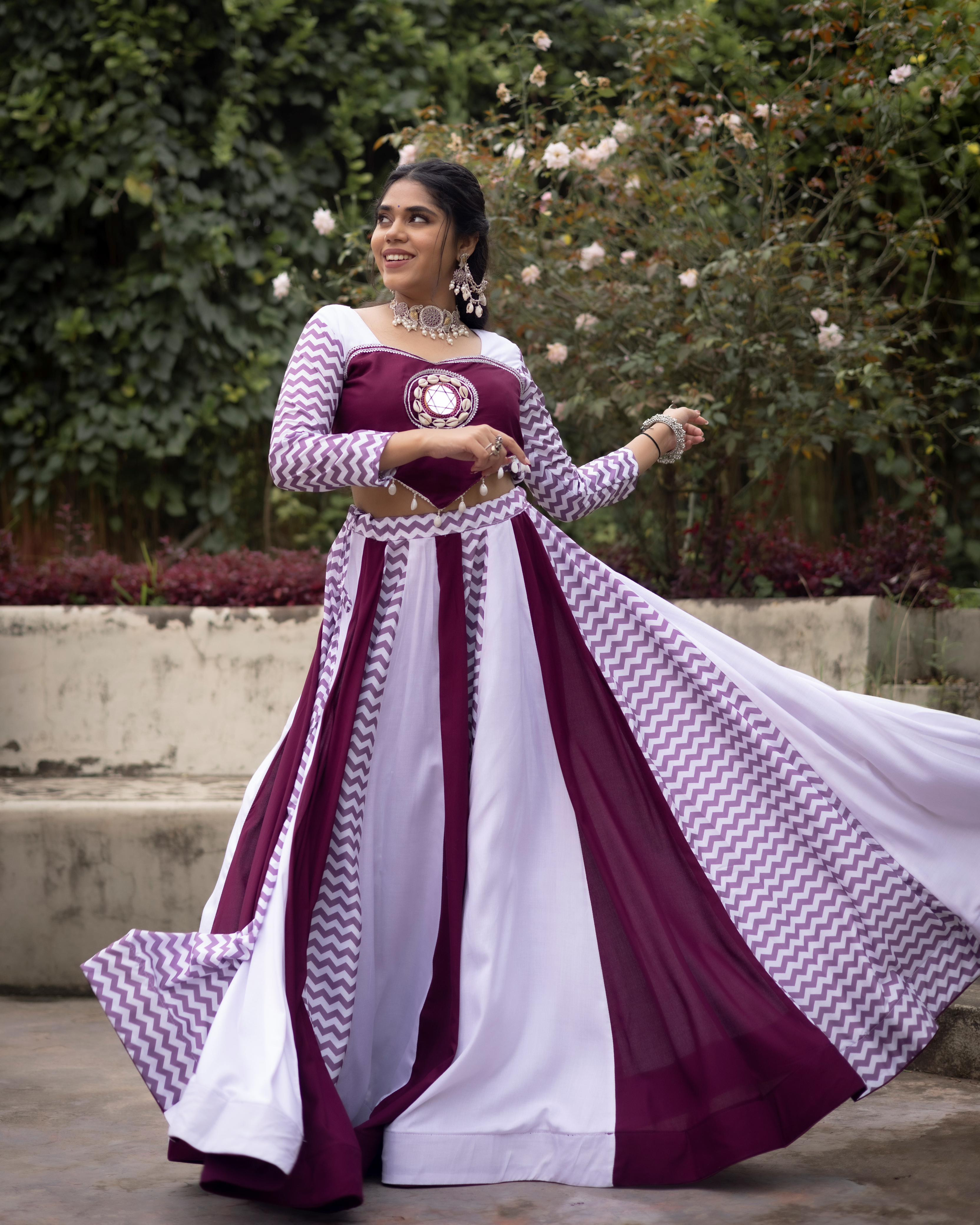 This wine and white lehenga showcases timeless Ethnicity With Muslin Leriya Touch ups,Designed for dance and devotion,Let your Navratri look glow with this wine-toned lehenga with white leheriya stripes.