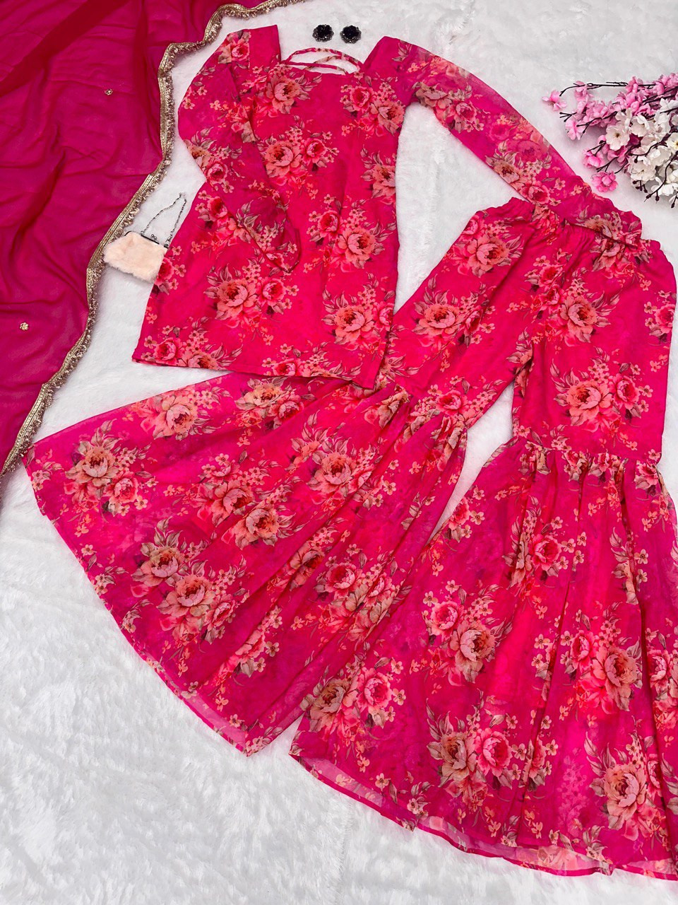 Step into elegance with our Exclusive Sharara Pair Design, crafted in premium digital printed georgette. The kurta features a stylish floral print with a length of 33+, paired with a beautifully flared sharara featuring an adjustable elastic waist for a perfect fit. Completing the look is a 2-meter georgette dupatta adorned with delicate butti work.