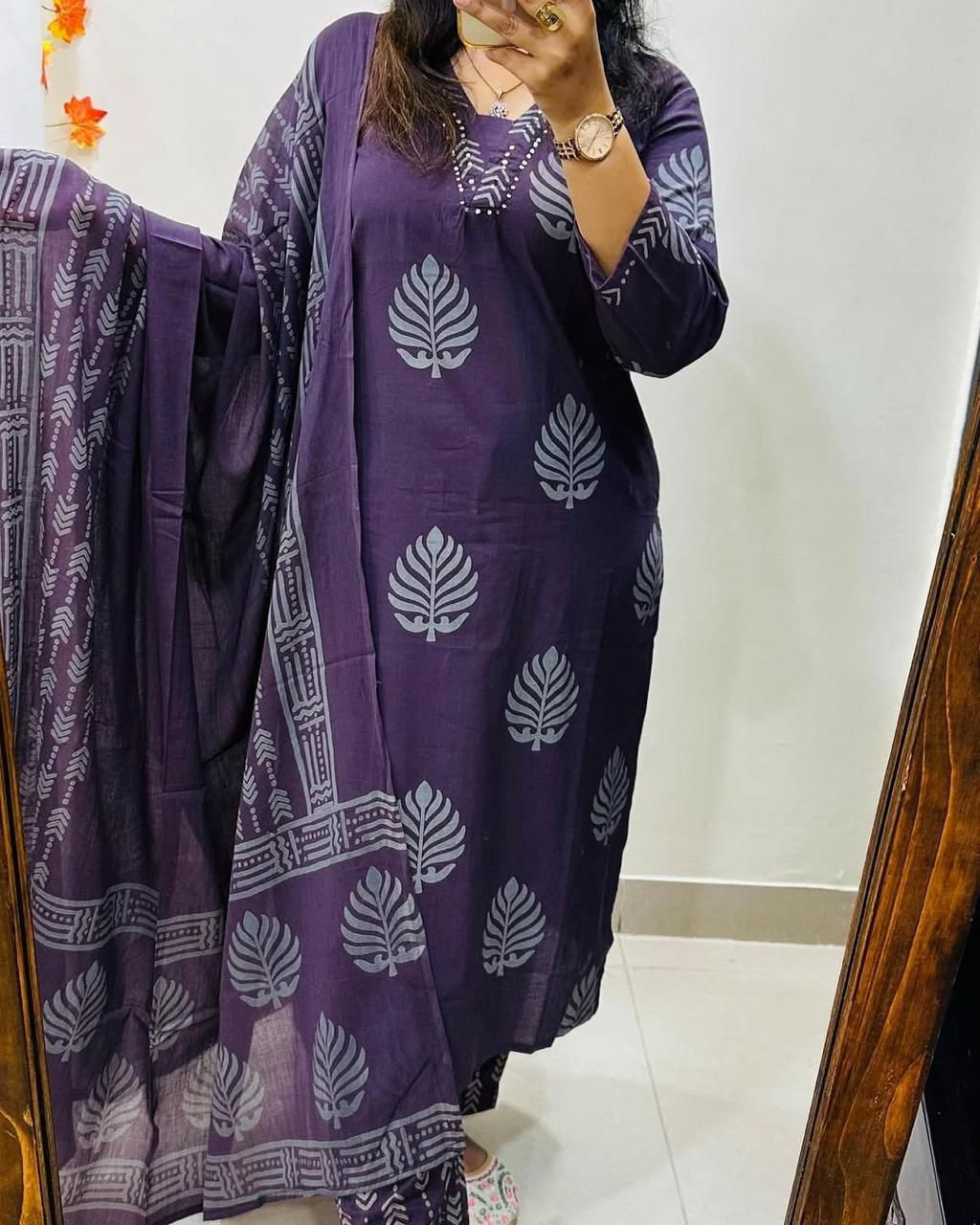 Crafted from pure fine heavy cotton, this beautifully designed set includes a kurti, pant, and dupatta, perfect for festive occasions and special gatherings.