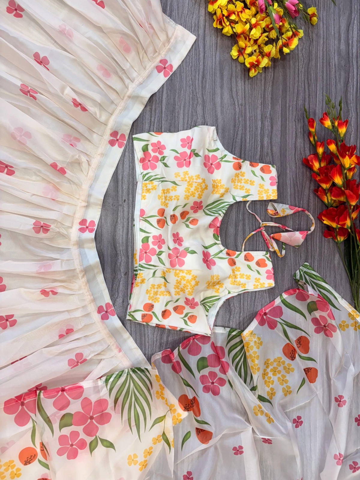 Lehenga: Made from premium tabby silk featuring beautiful floral prints, enhanced with heavy cancan and inner lining for a voluminous 3.5-meter flair. Semi-stitched design fits up to XXL for a comfortable and customizable fit.