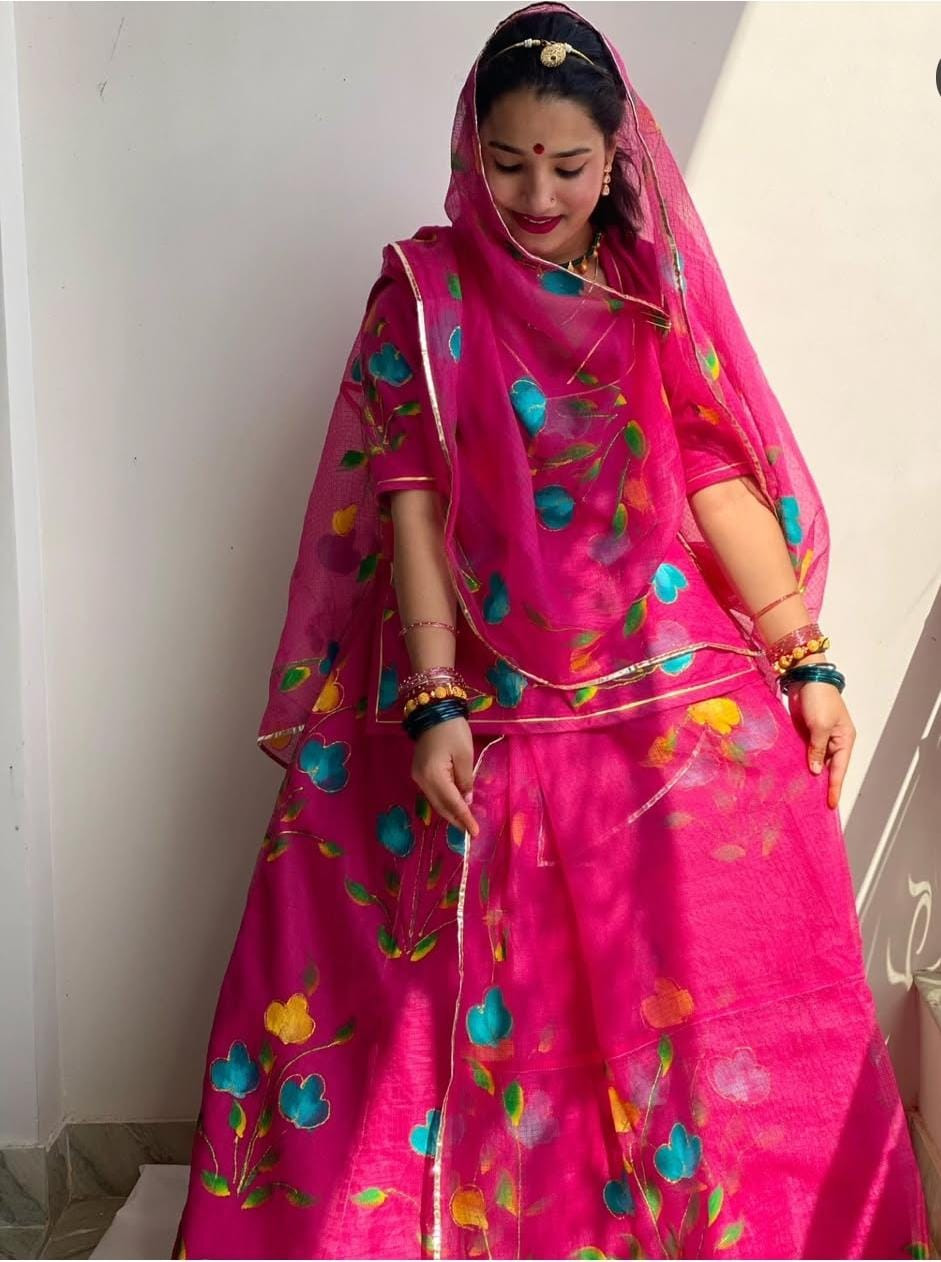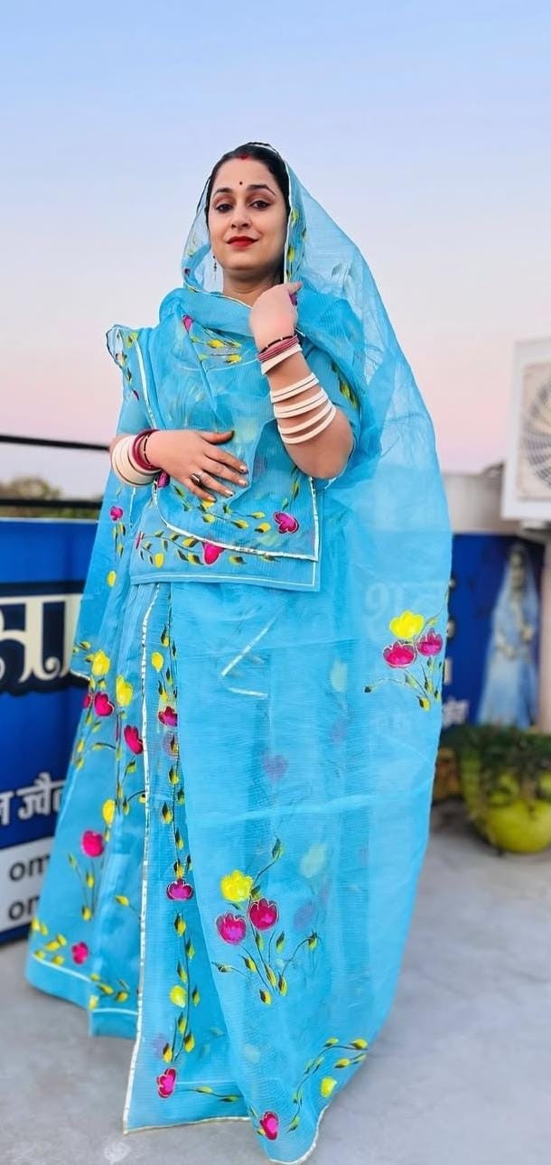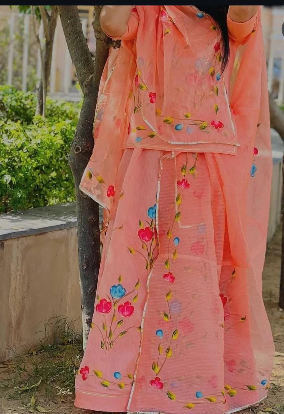 Step into elegance with this most trending Hand-Painted Kota Doriya Poshak, crafted for those who adore timeless Rajasthani tradition with a modern twist. The poshak features a beautifully hand-painted Kota Doriya odhni, adding a delicate charm to the overall ensemble.
