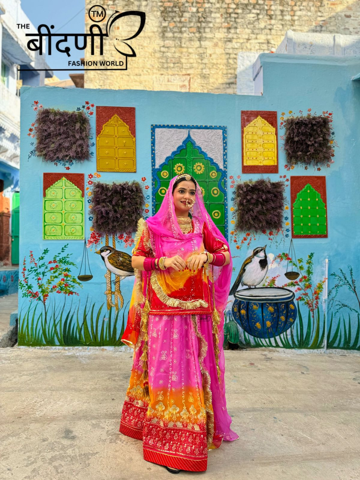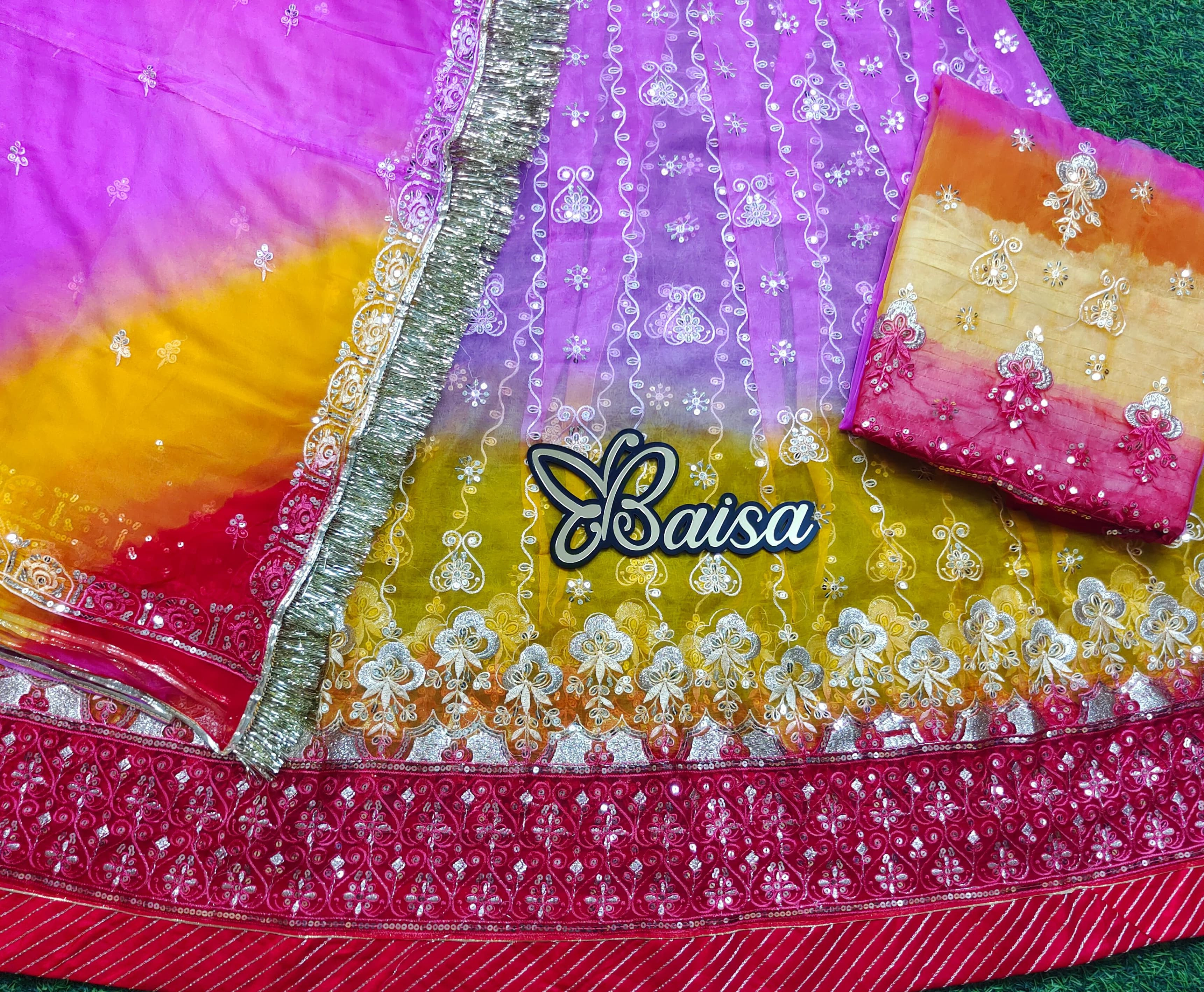 The organza Rajputi poshak is a traditional attire worn by women in Rajasthan, especially during special occasions and festivals. Made from lightweight, sheer organza fabric, this poshak often features vibrant colors and intricate embellishments like embroidery, mirror work, and lace.
