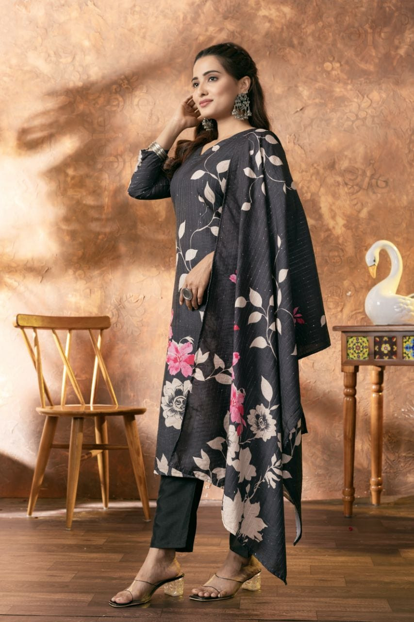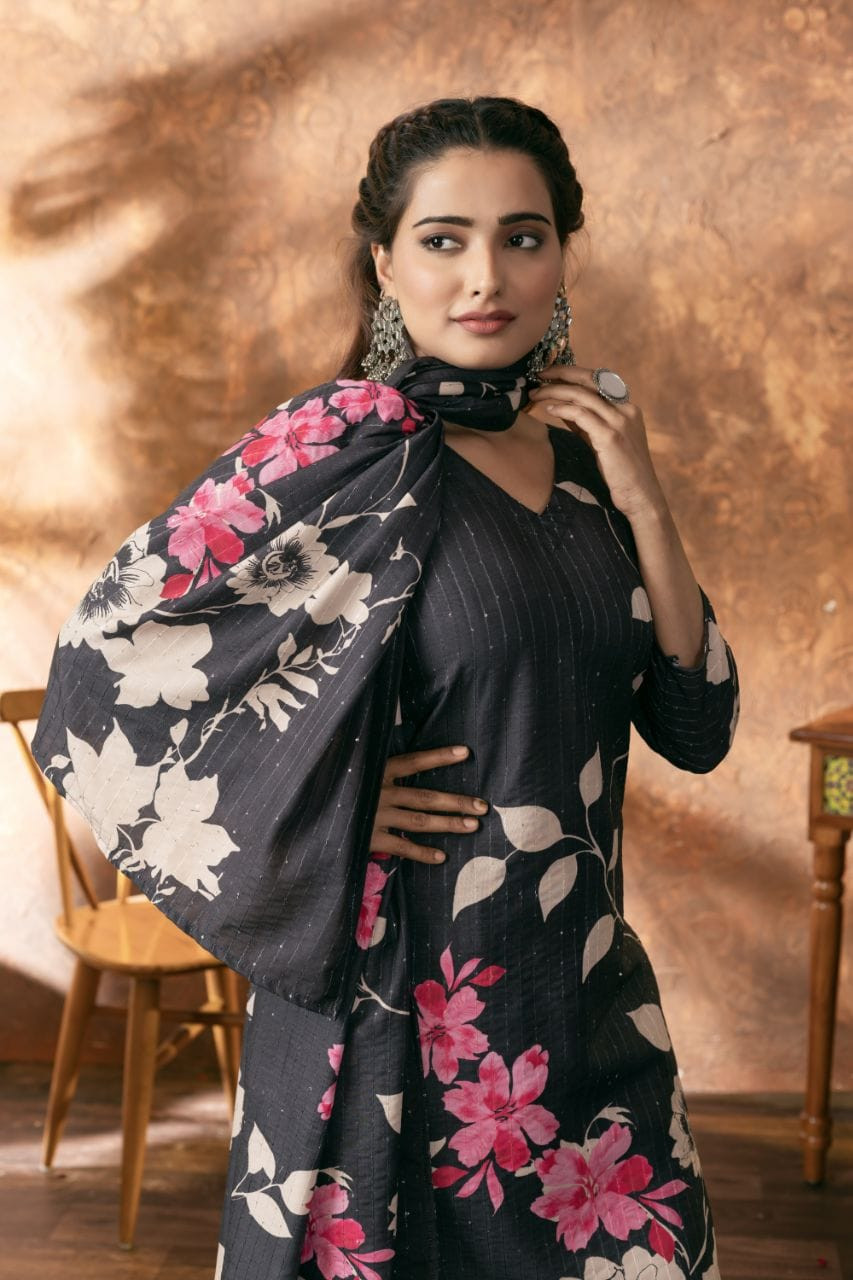 The set includes a lined top, matching bottom, and dupatta, making it a complete and ready-to-wear choice for effortless style. Experience the perfect blend of tradition and modern charm.