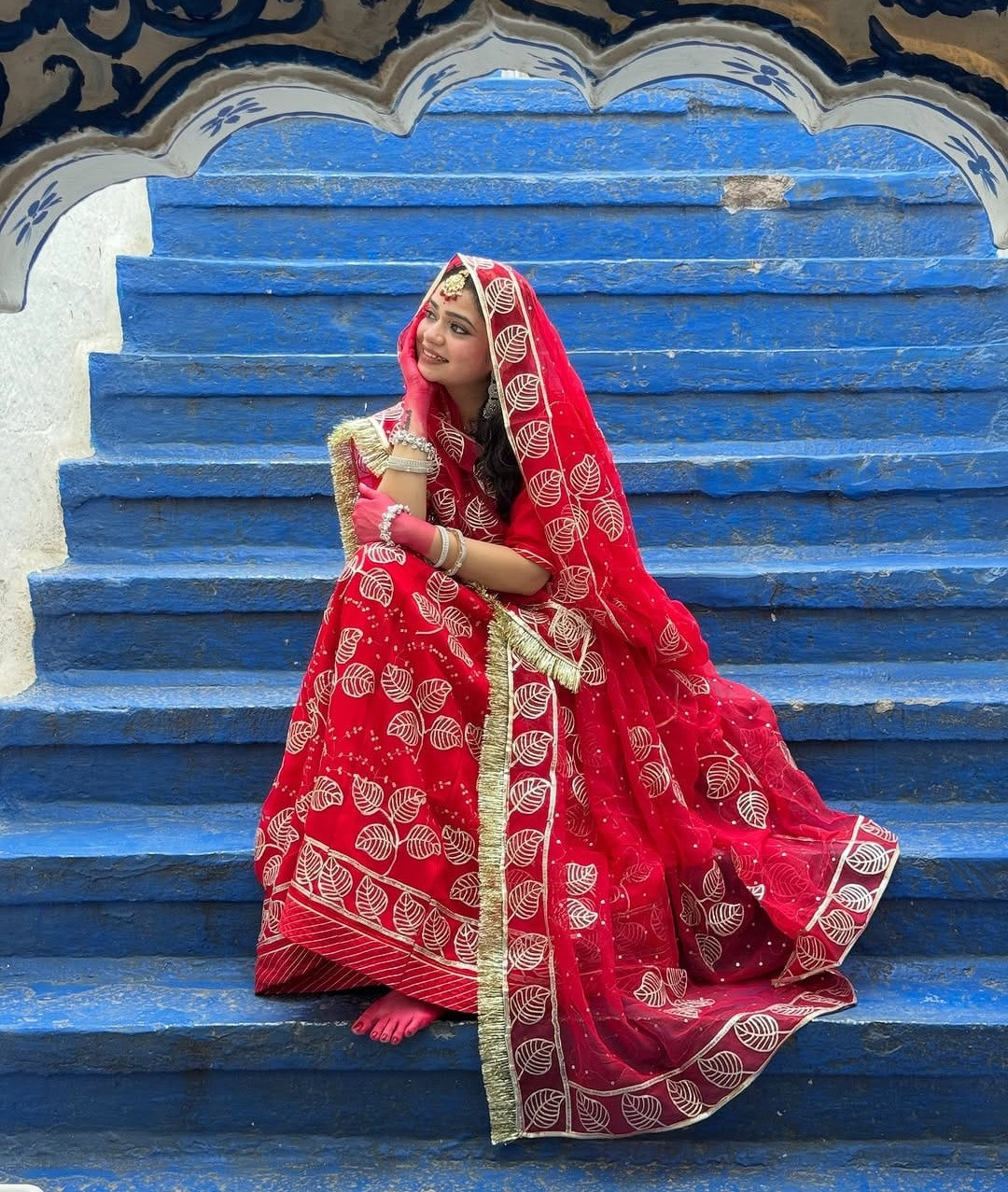Wrap yourself in the timeless grace of Raktraag, A red ribbon suit crafted in luxurious hamrai fabric. Paired with a complementing hamrahi odhna, this ensemble exudes royal elegance with every detail. The deep red hue reflects passion and festivity, while the flowing drape ensures a regal charm perfect for weddings, occasions, and traditional gatherings. A masterpiece from Bindani, made for those who carry heritage with pride and beauty.