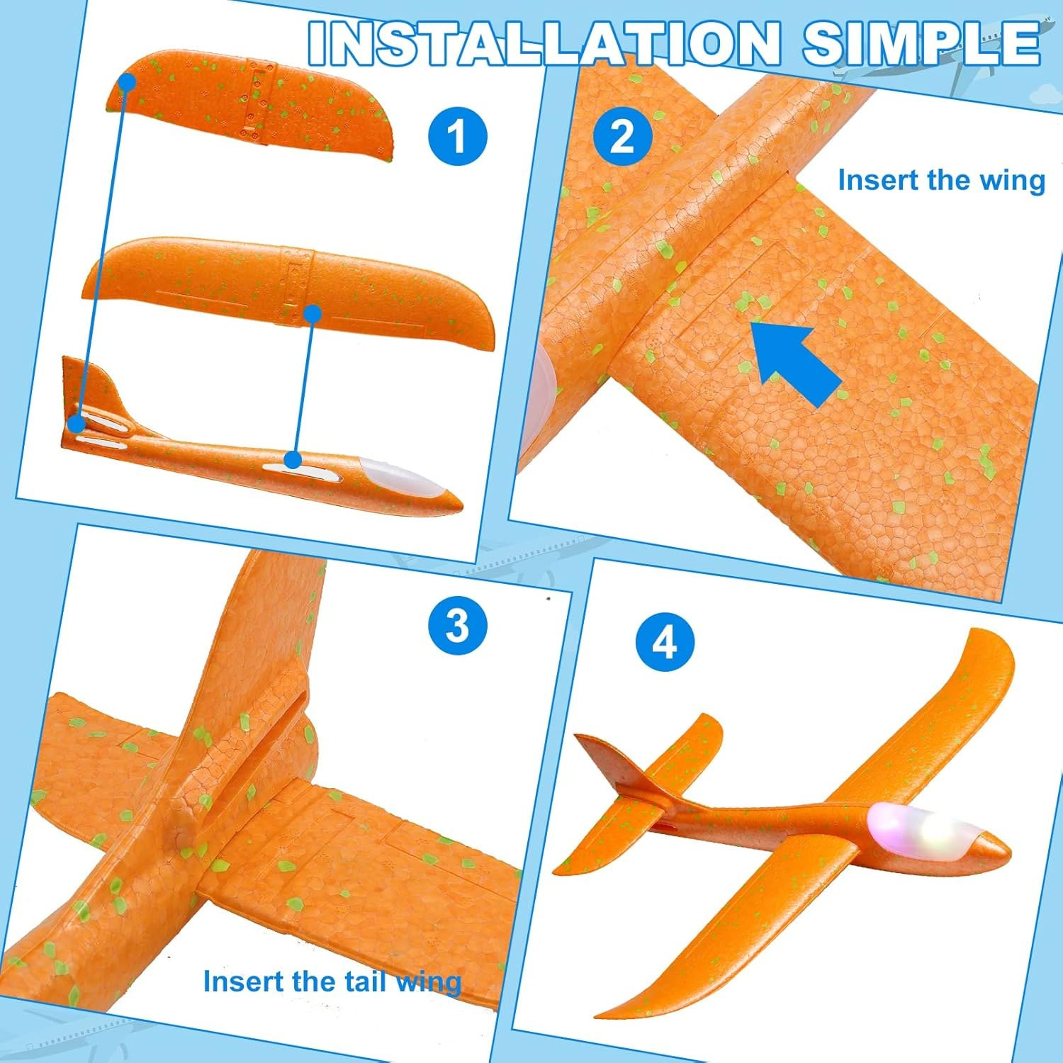 But the fun doesn't stop when the sun goes down! Equipped with vibrant, eye-catching LED lights, this foam airplane transforms twilight into a magical spectacle. The bright LEDs make every flight a dazzling display, easily visible in low-light conditions. Imagine the thrill of launching a glowing aircraft into the evening sky, creating unforgettable memories and a captivating show for everyone to enjoy.