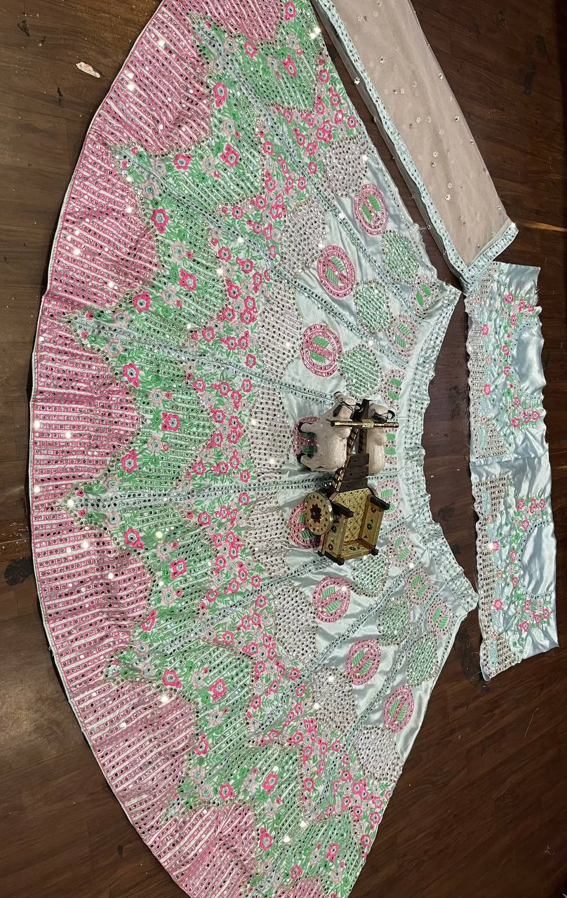 Step into the spotlight with our Real Mirror Lehenga, a masterpiece that blends glamour, comfort, and tradition. Crafted from premium Malai Satin Silk, this semi-stitched lehenga radiates royal charm with heavy real mirror embroidery work. The 3.5-meter flare, enhanced with Can-Can and Canvas Patta, ensures a voluminous and graceful look for every occasion.