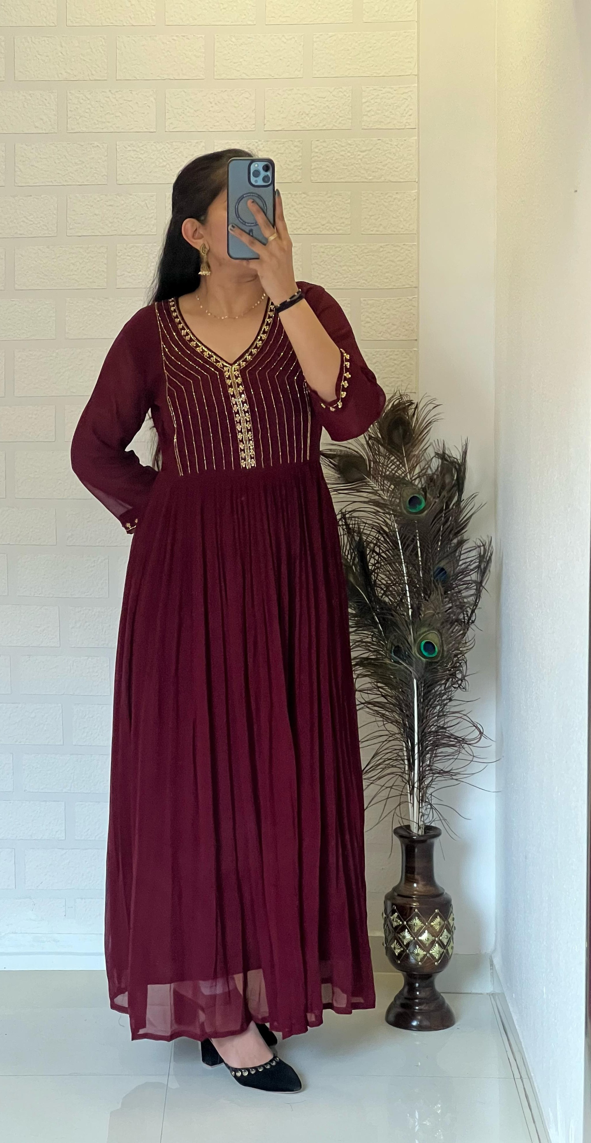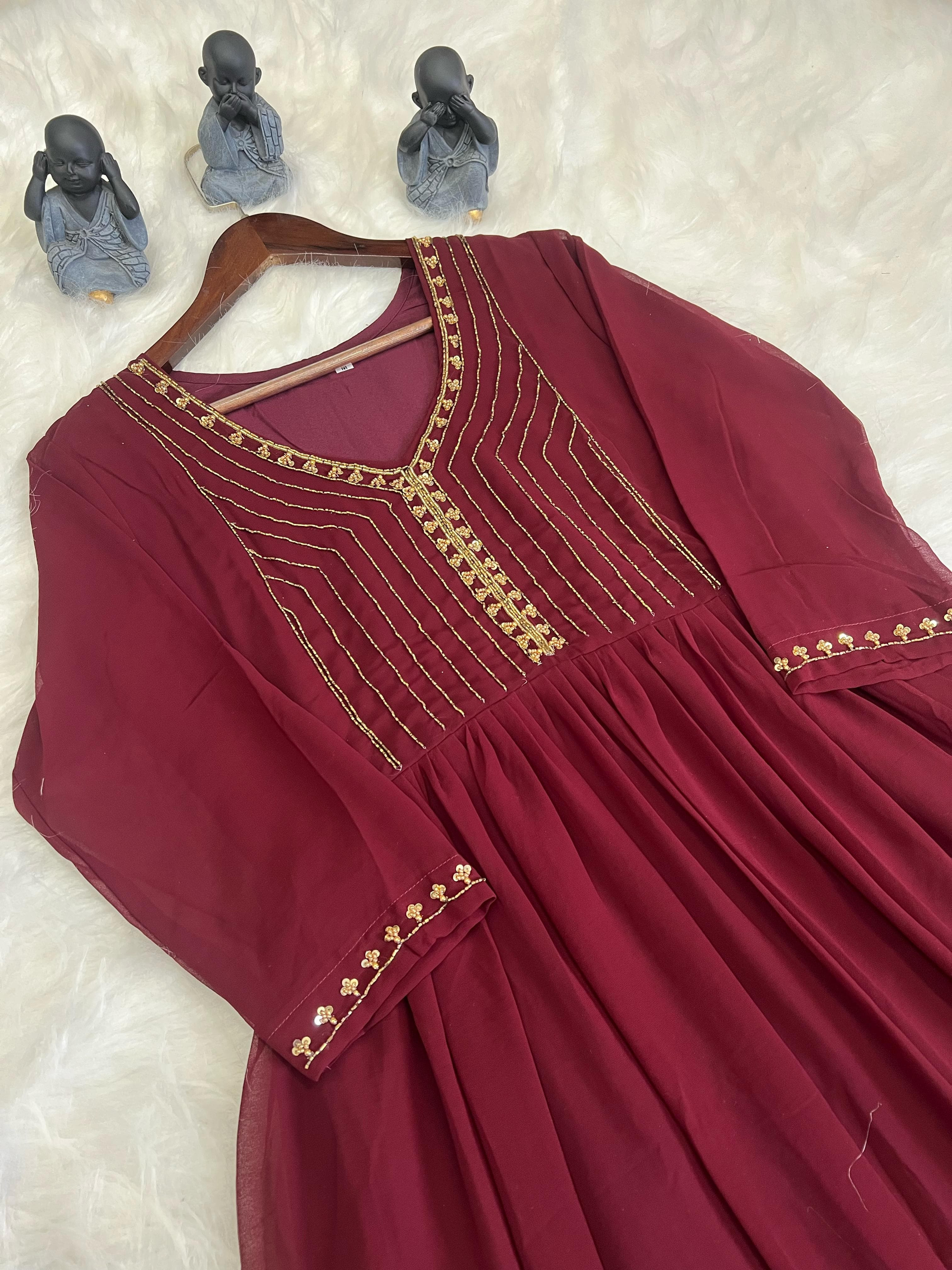 FABRIC - BLOOMING GEORGETTE KURTI WITH BEAUTIFUL NECK AND DESIGNER SLEEVES WITH HANDWORK ( KHATLI - Maggam Work )
