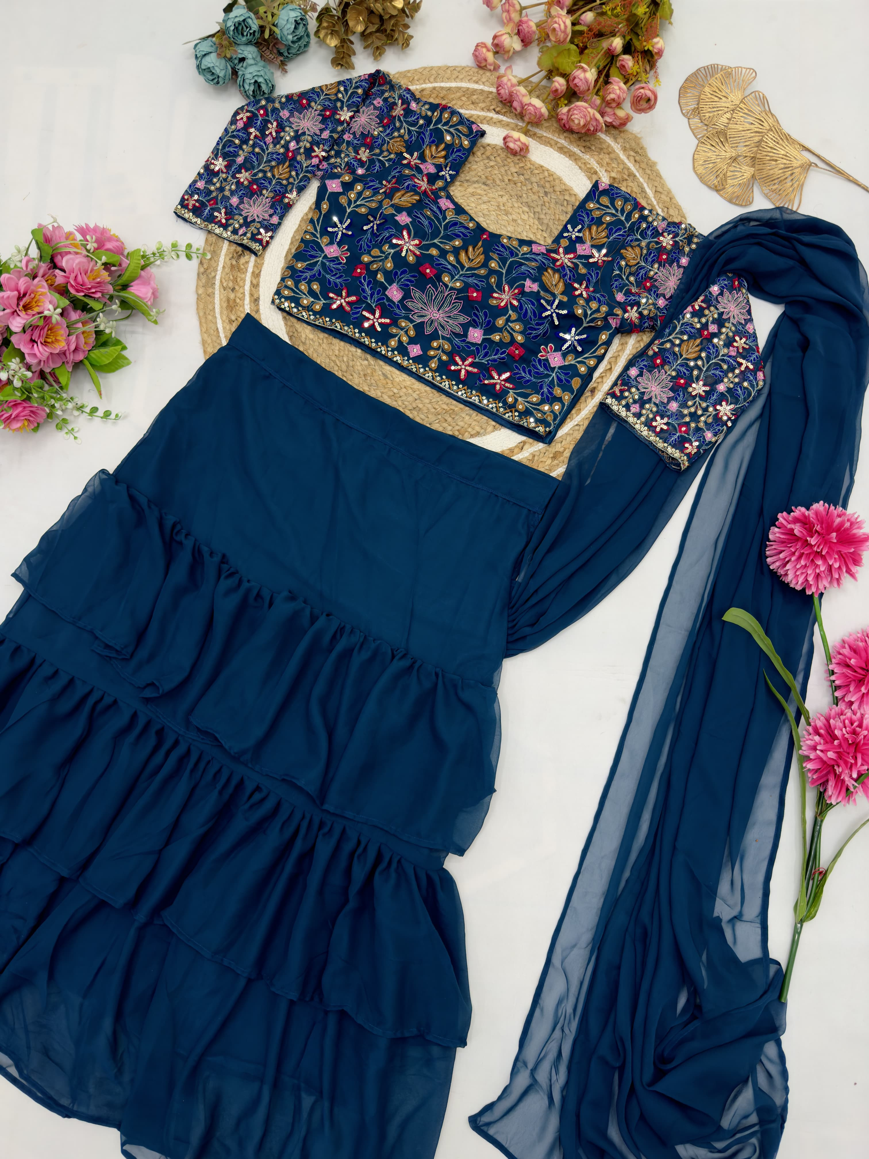 Lahenga Saree Heavy Faux Georgette 3 Layer Ruffle With Attached Dupatta