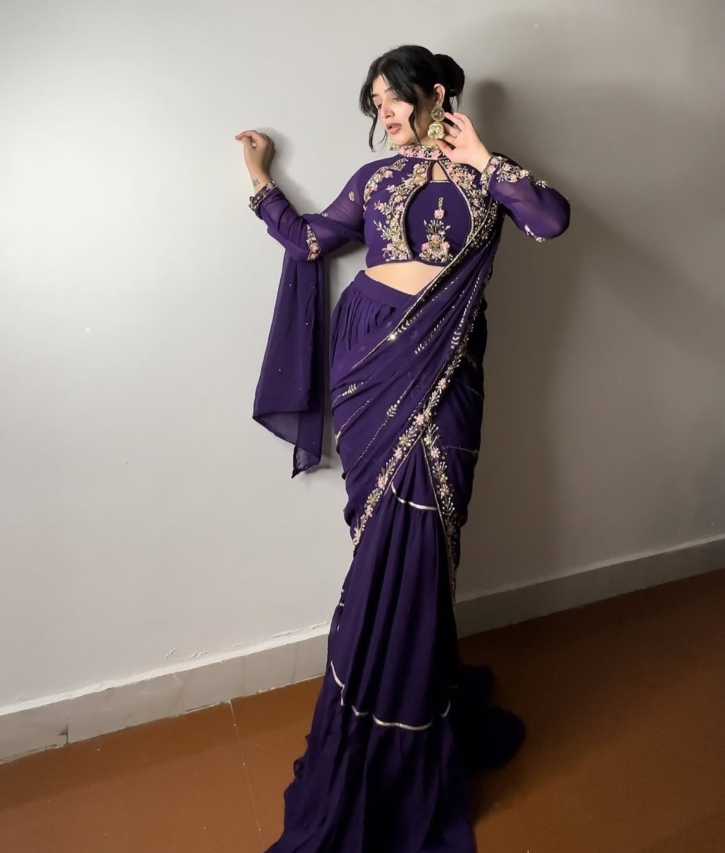 Lahenga Saree Faux Georgette With Multi Thread Embroidery Real Mirror Ruffle With Attached Dupatta