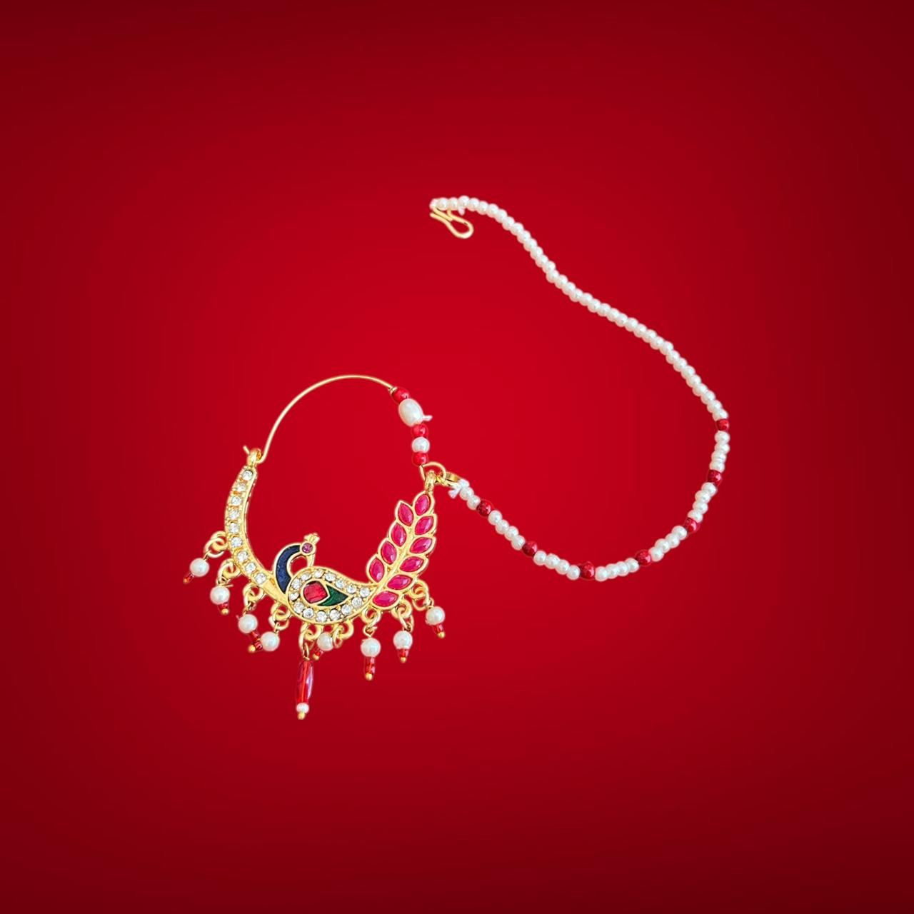 peacock design Nath (nose ring) with pearl and green stone embellishments, featuring a chained attachment.