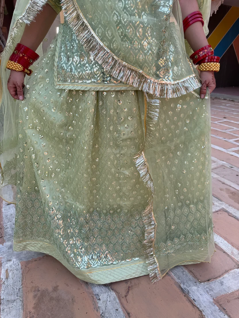 Pair it with statement jewelry to elevate the look further, or keep it minimal for a subtle, refined appearance. The "Graceful Elegance: Pista Green Net Poshak" is more than an outfit—it's a celebration of heritage, style, and grace.