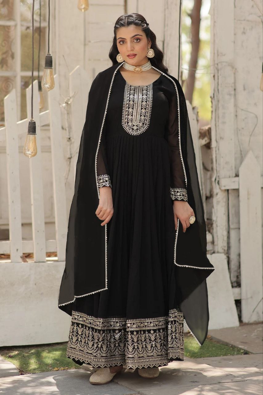 Make a grand entrance with this Premium Black Trinari Anarkali Gown, perfect for weddings and special occasions. Crafted in soft georgette fabric, the gown features exquisite embroidered detailing on the top for an elegant look.