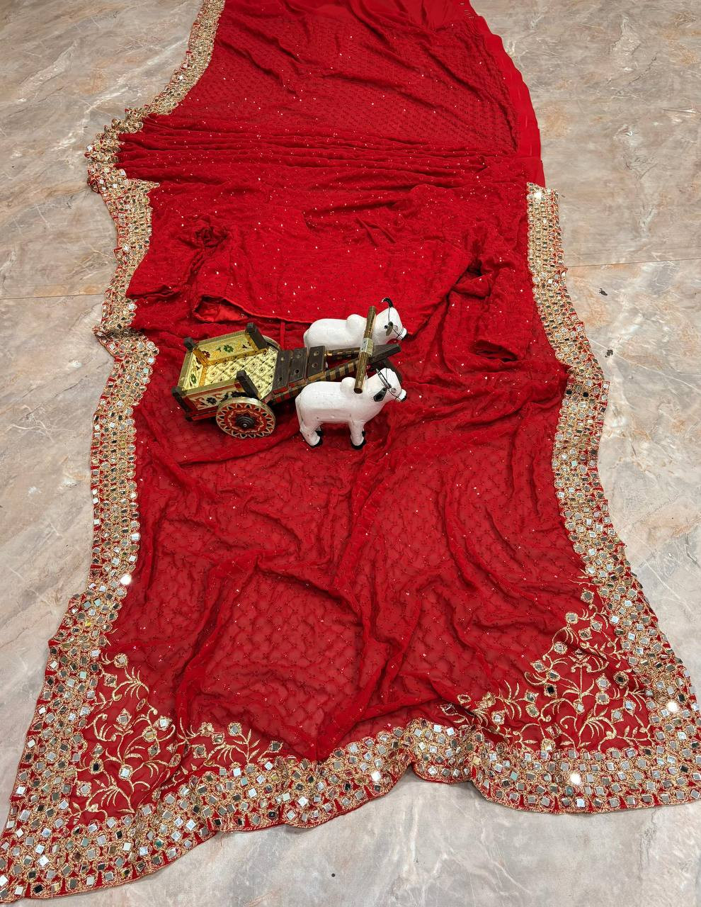 Step into effortless elegance with this Premium Faux Georgette Ready-to-Wear Saree, designed to offer the perfect balance of glamour and comfort. Crafted from lightweight faux georgette, this saree features exquisite embroidery sequins work enhanced with real mirror detailing, making it ideal for festive occasions, parties, and celebrations.