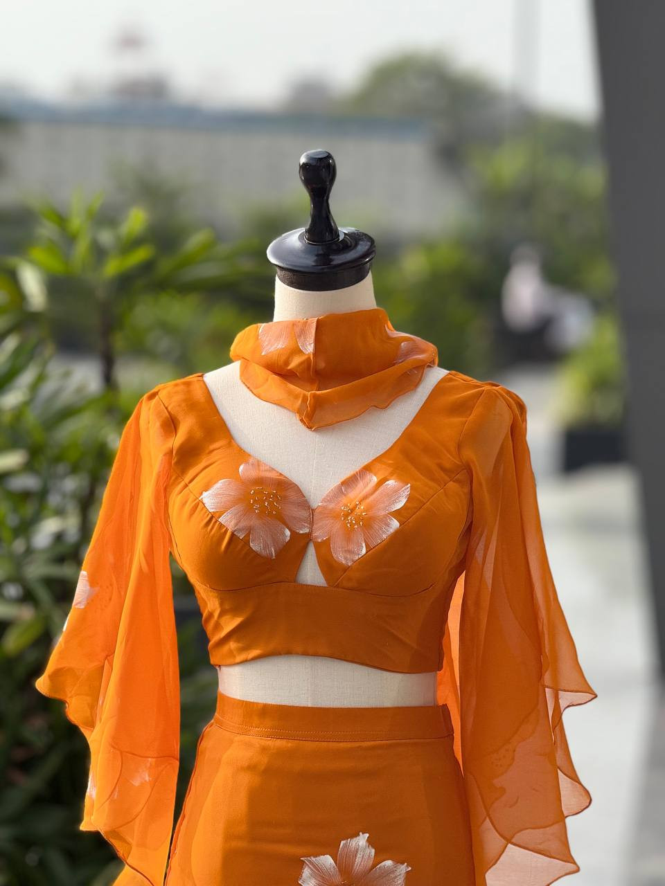 Lehenga: Stunning Georgette fish-cut lehenga beautifully styled with hand-paint patterns. Comes with an adjustable waist elastic & dori, ensuring the perfect comfort fit.