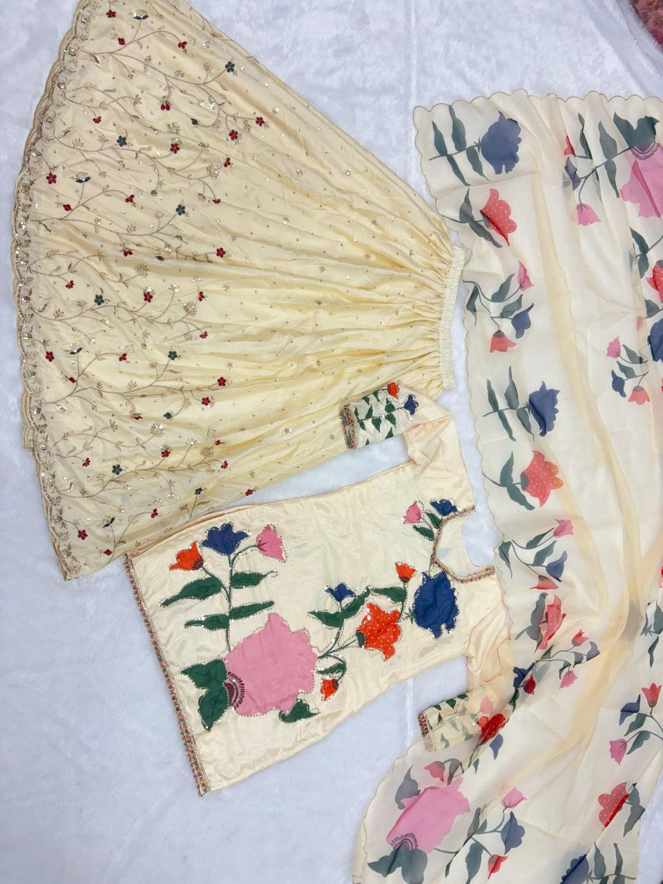 Add elegance to your ethnic collection with this Premium Chinon Silk Lehenga Choli Set designed with beautiful embroidery and sequins work. The stylish top features elegant print, rich embroidery sequins work and lace detailing on the neck, sleeves and hemline, giving it a luxurious festive look. The lehenga is crafted from premium chinon silk with detailed embroidery sequins work and soft silk inner for comfortable wear.
