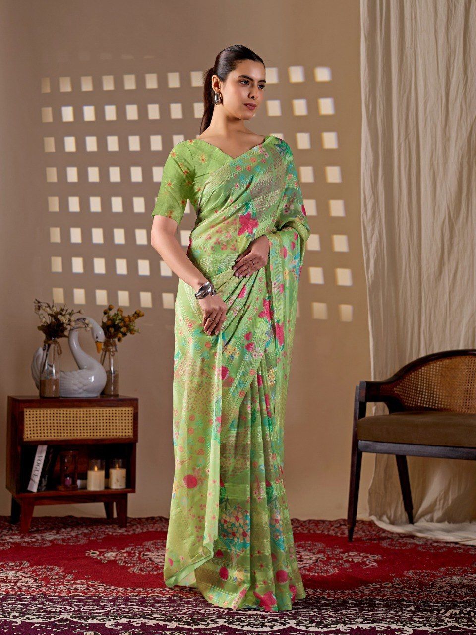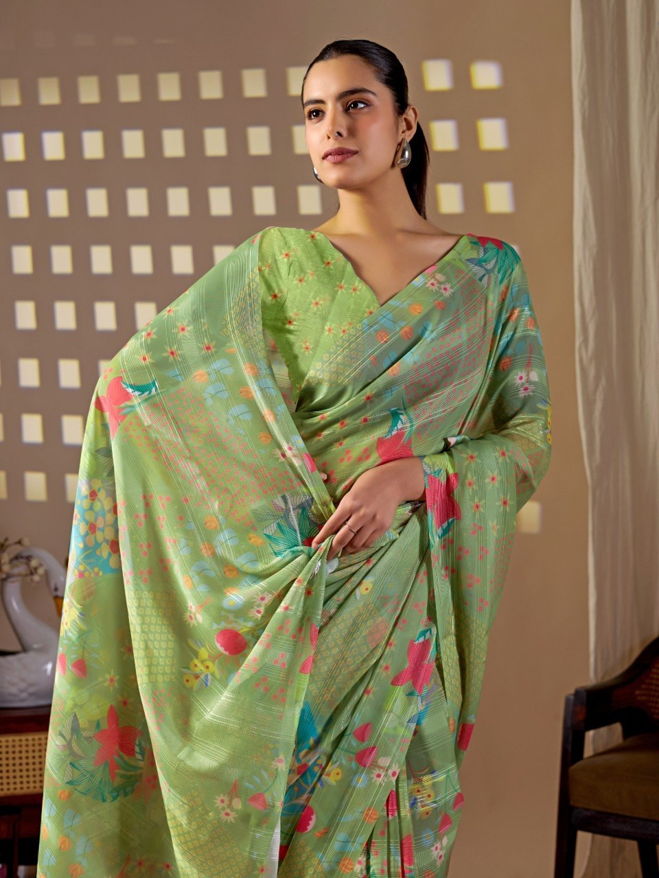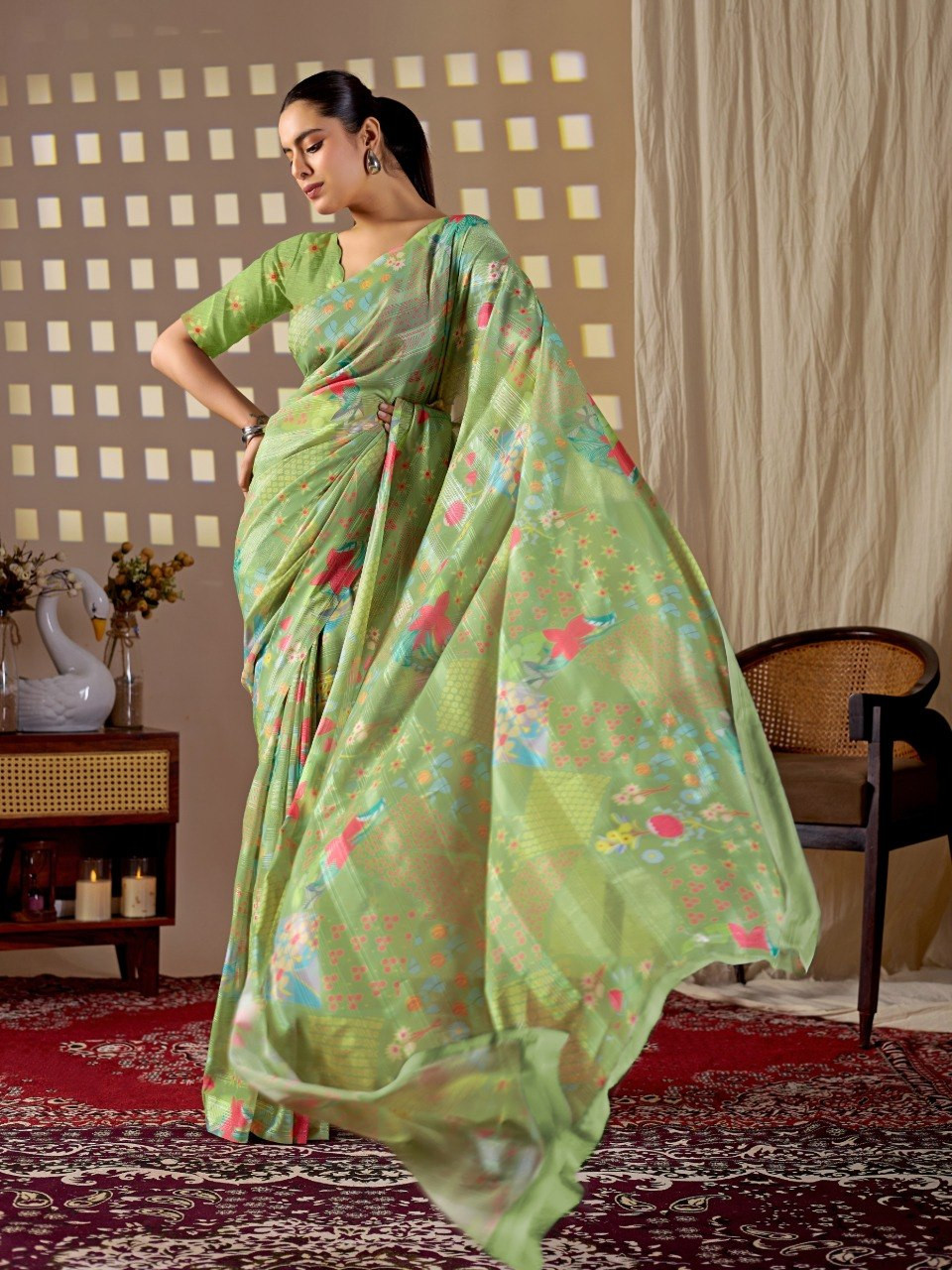 Upgrade your ethnic wardrobe with this premium monsoon saree crafted in a refreshing pista green base. Beautifully enhanced with vibrant multicolor floral digital prints, this saree offers a perfect blend of elegance and liveliness. The soft, flowy texture ensures comfortable draping, making it ideal for daily wear, festive occasions, or casual outings.