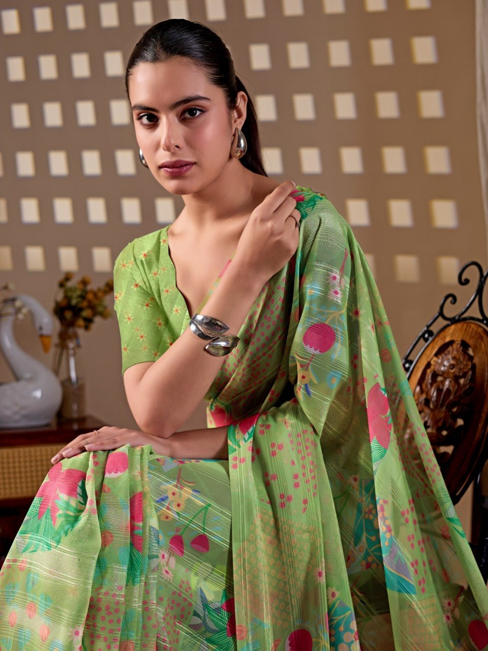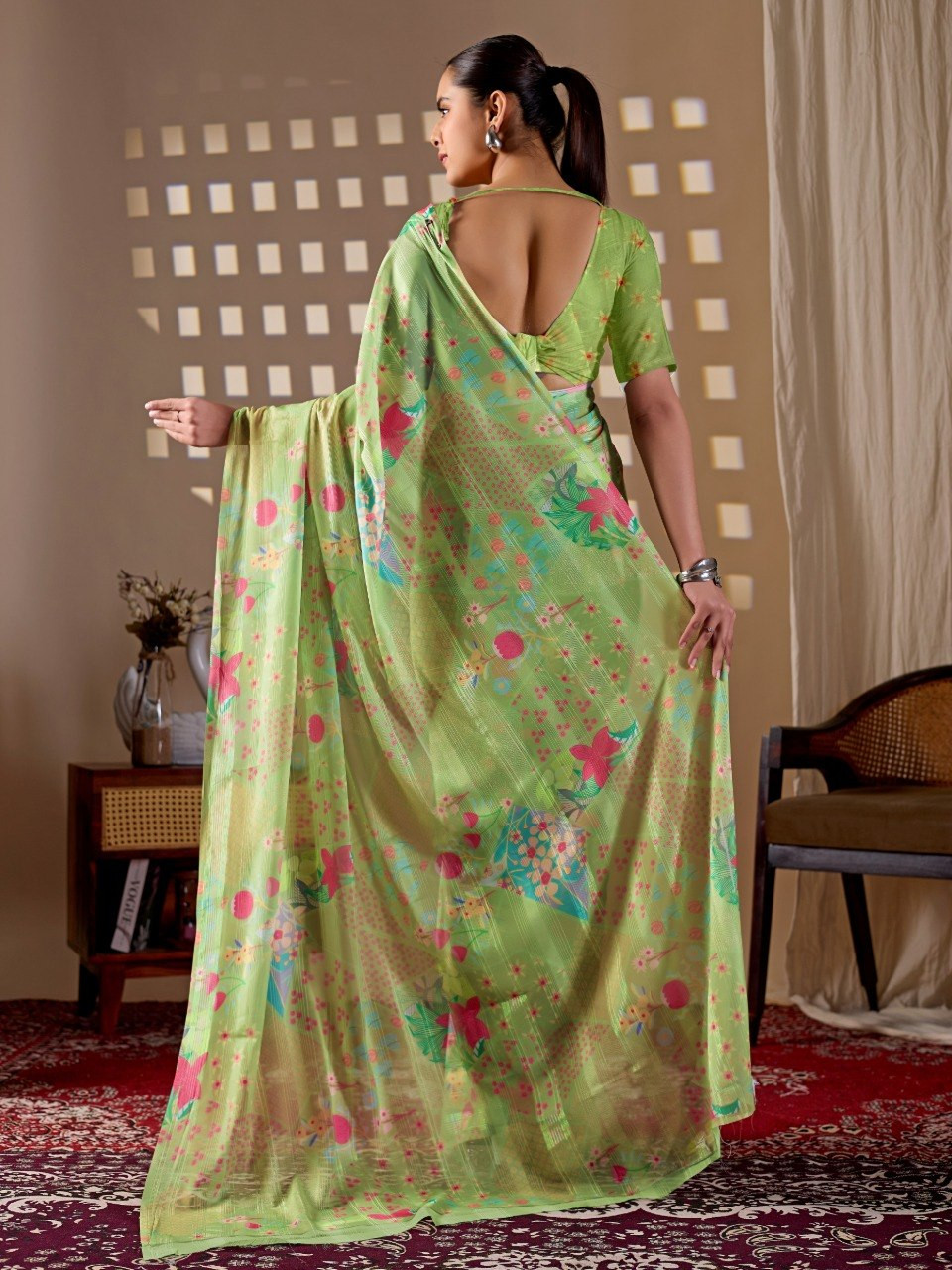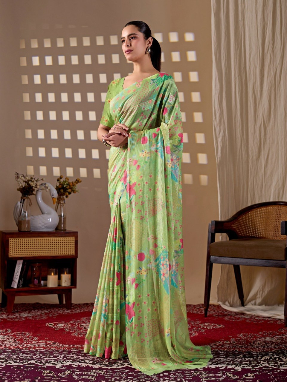 Upgrade your ethnic wardrobe with this premium monsoon saree crafted in a refreshing pista green base. Beautifully enhanced with vibrant multicolor floral digital prints, this saree offers a perfect blend of elegance and liveliness. The soft, flowy texture ensures comfortable draping, making it ideal for daily wear, festive occasions, or casual outings.