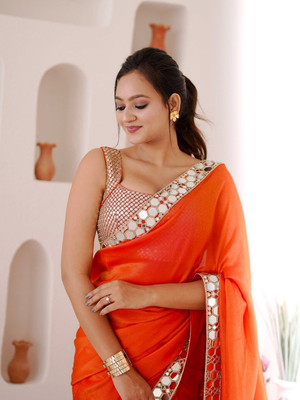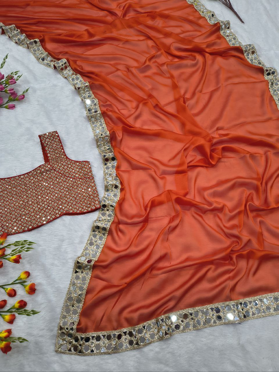 Enhance your ethnic wardrobe with this elegant Premium Rangoli Silk Saree, beautifully designed with a heavy real mirror work lace border that gives a rich and festive look. The smooth and graceful Rangoli silk fabric drapes perfectly, making it ideal for weddings, parties, and festive occasions.