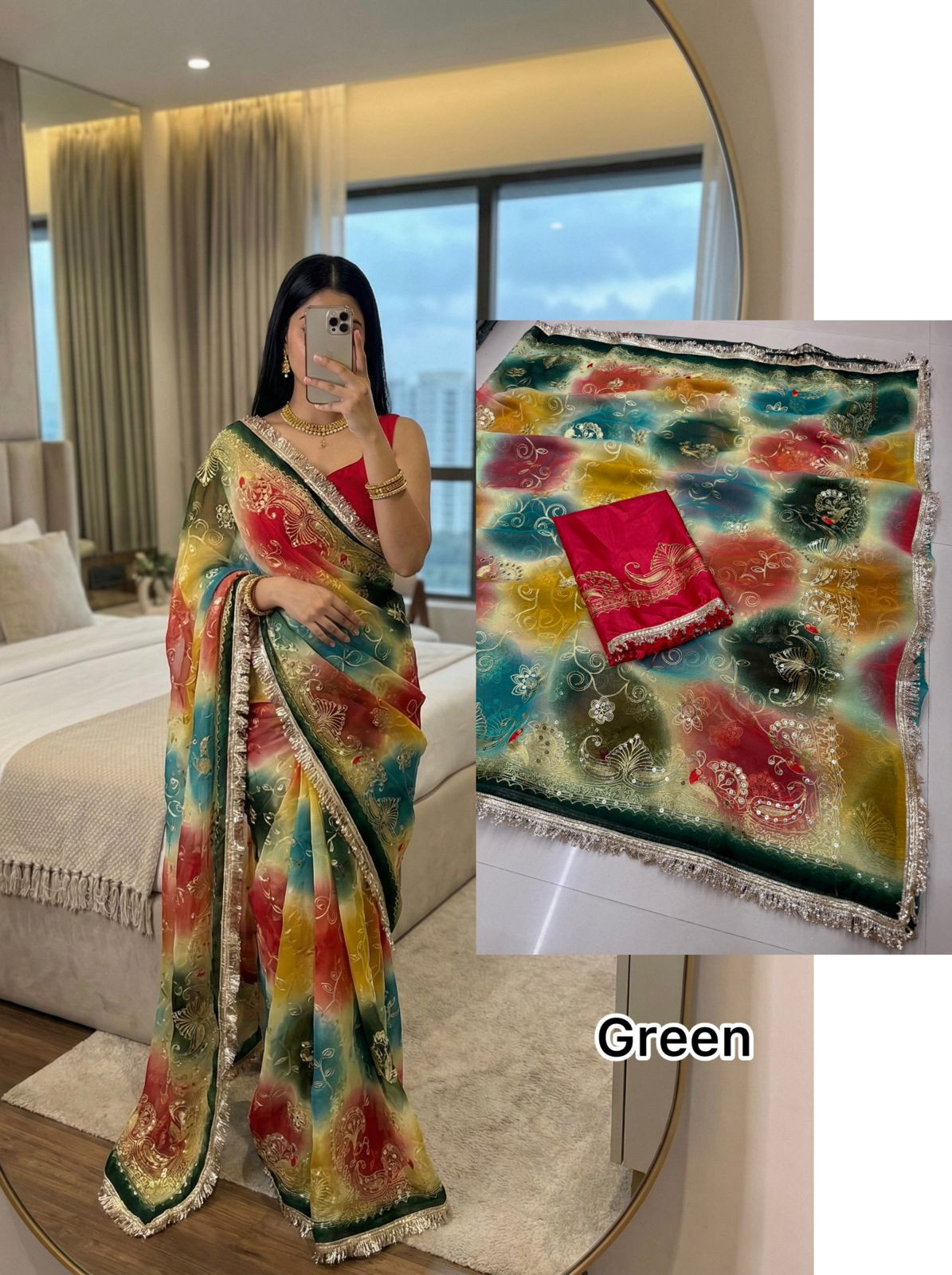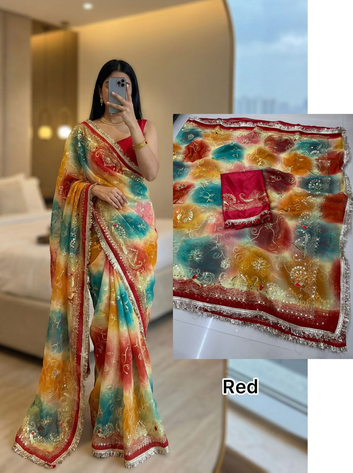Elevate your ethnic style with this Premium Royal Georgette Saree, crafted from original royal georgette fabric for a soft, flowy, and luxurious drape. The saree is beautifully adorned with 5mm less sequin kasab work, adding a subtle shimmer that enhances its royal appeal without being overpowering.