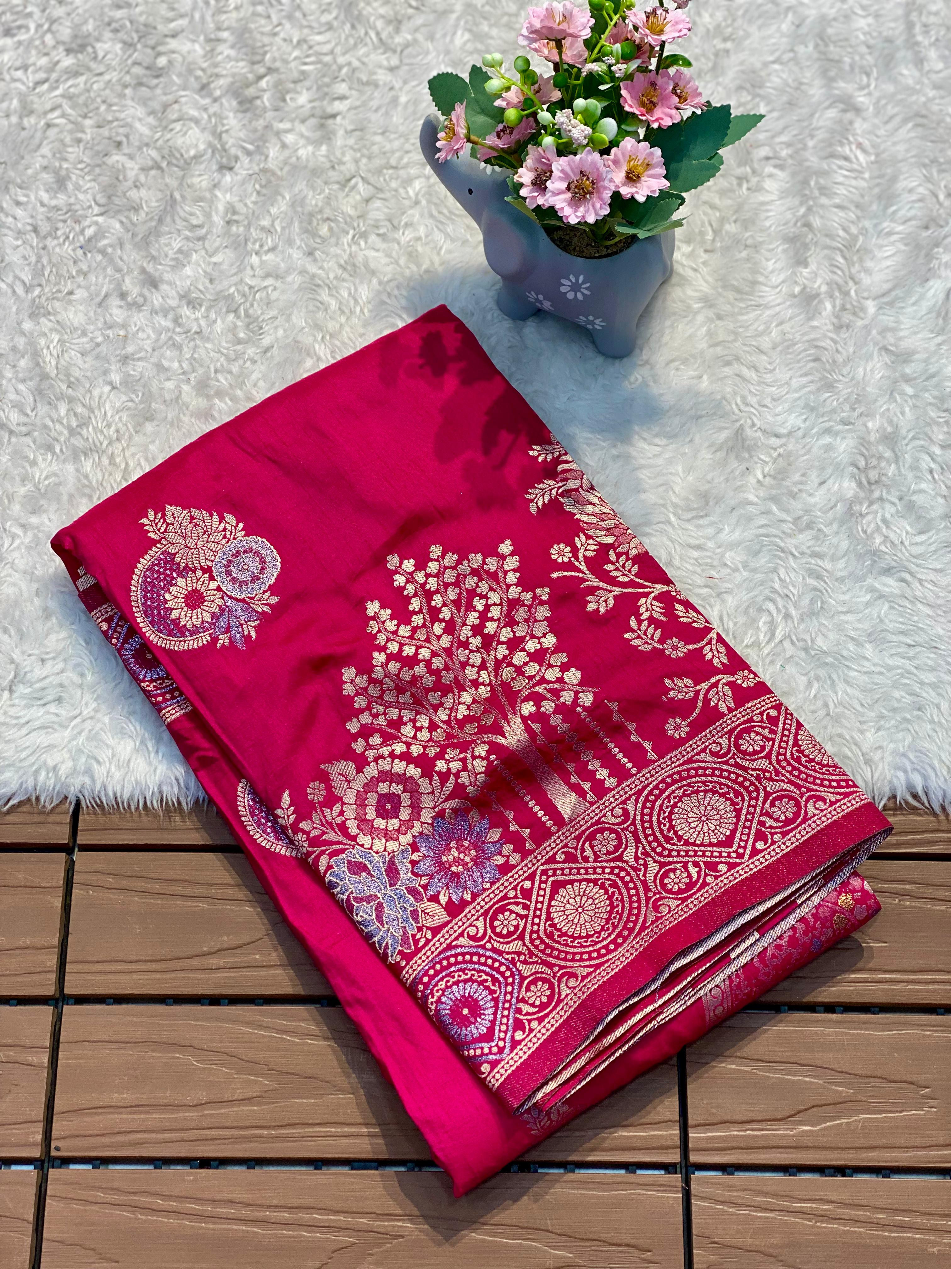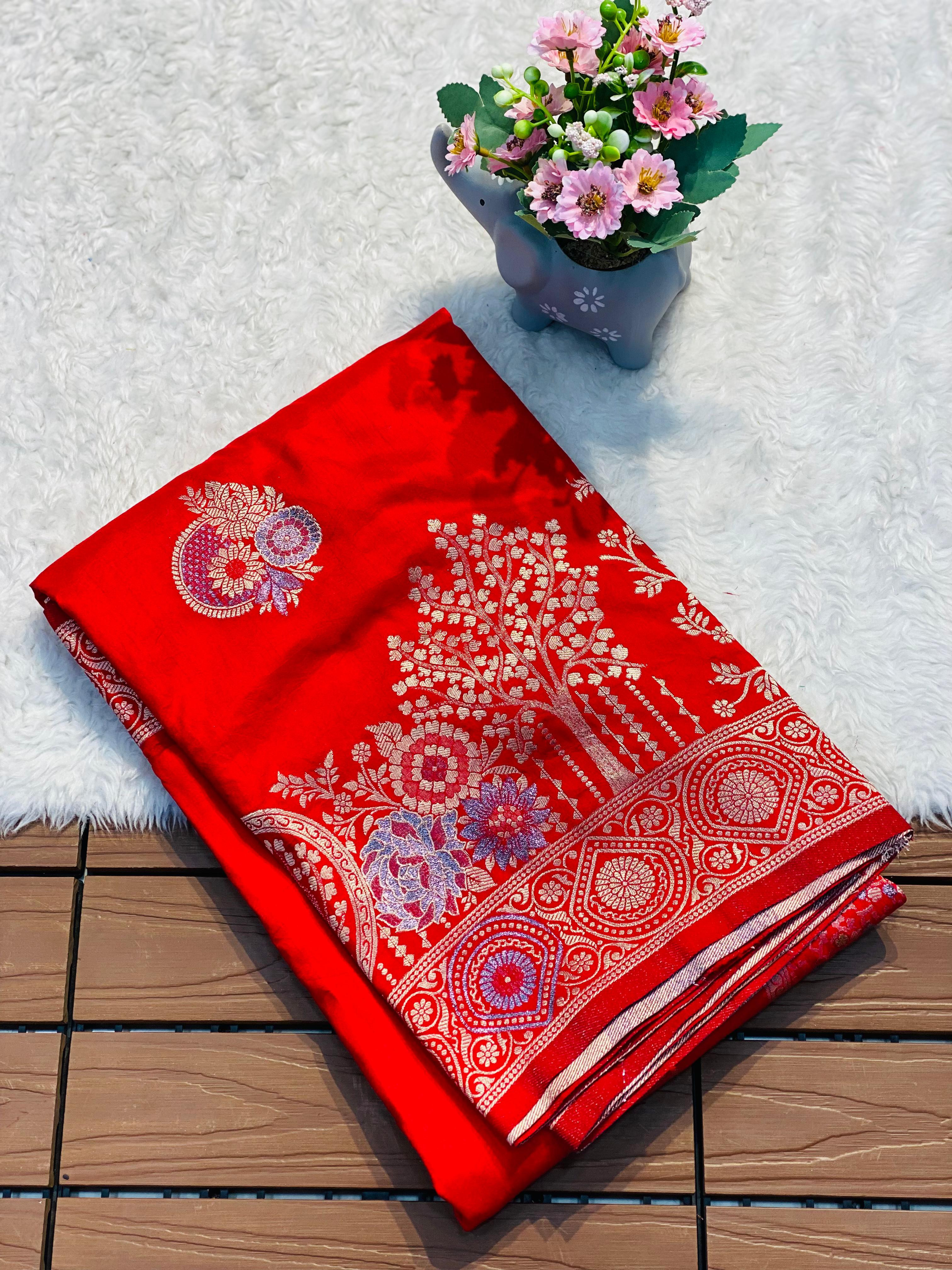 Pure Soft Banarasi Khadi Georgette Silk Silk Weaving Saree With Finest 3 Zari Wooven Pallu With Fancy Tassels n Zari Wooven Border With DESIGNER Body Weaving in Saree Having Running Barcode Butti Blouse