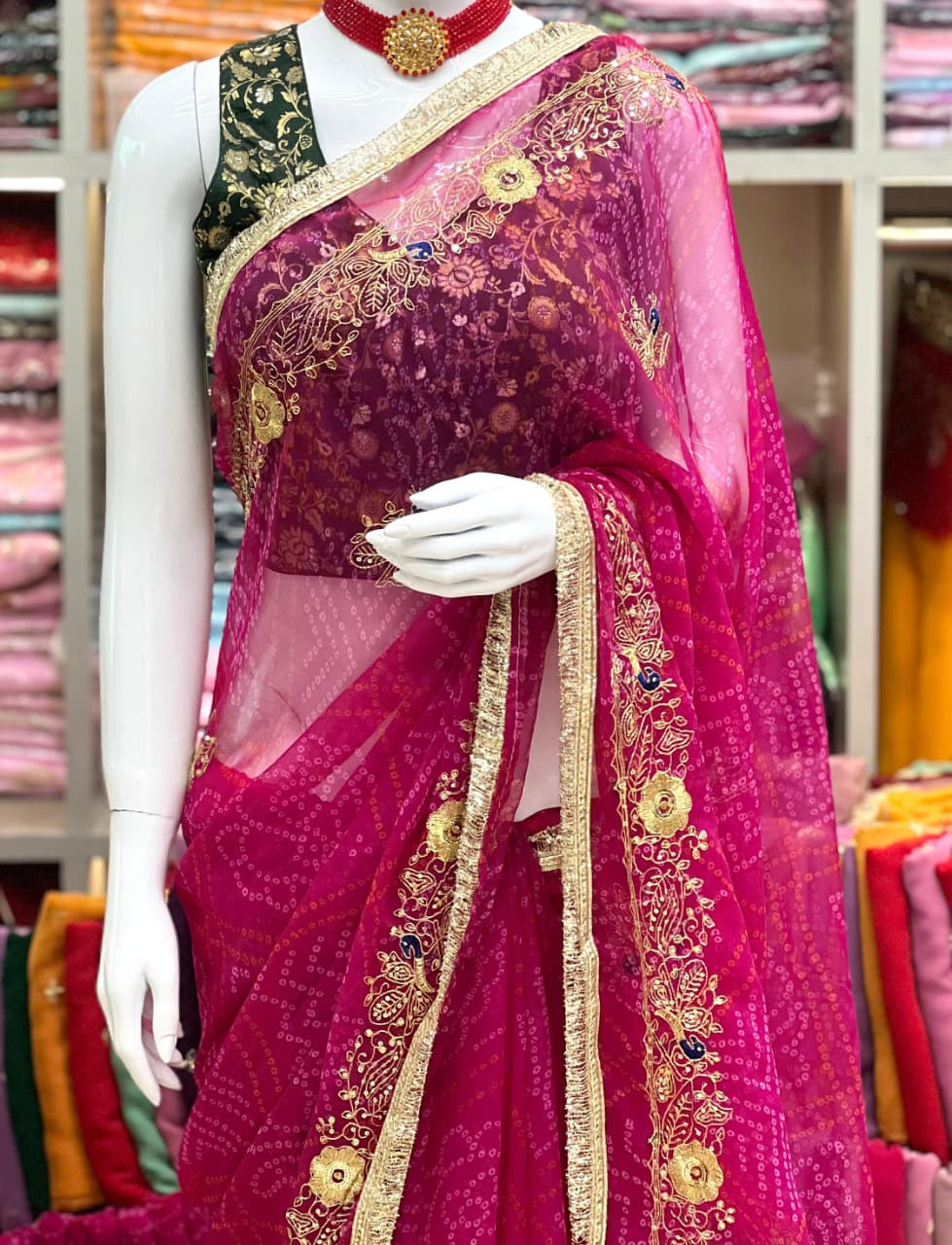 Perfect for festive occasions, cultural events, and casual traditional wear, this saree blends Rajasthani Bandhej style with modern elegance.