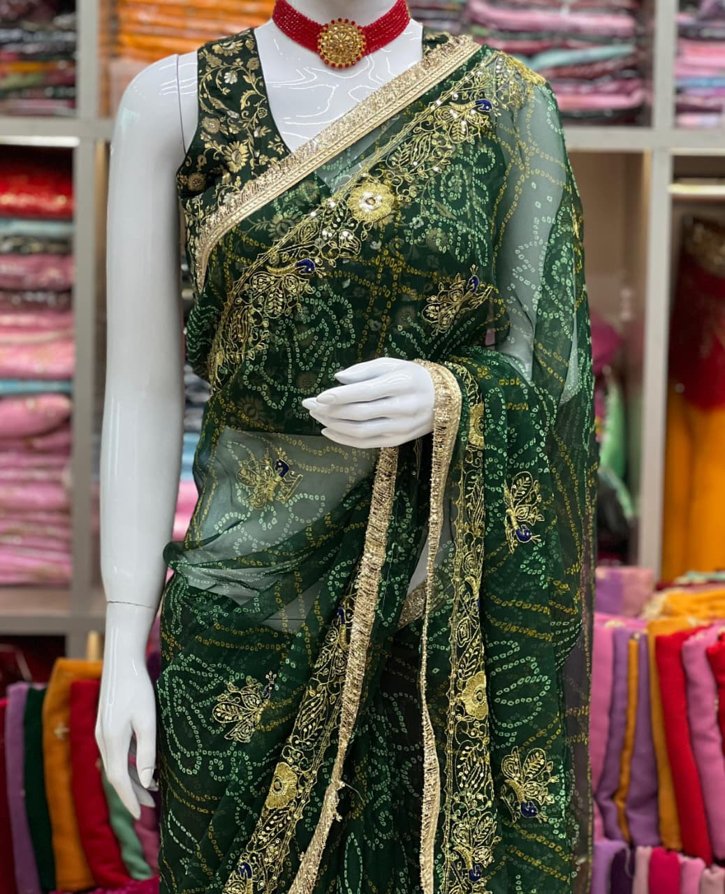 Grace your wardrobe with this elegant Rajwadi Bandhej Saree crafted from original georgette fabric, offering a soft, lightweight, and comfortable drape. The saree features delicate sequence work with minimal detailing, giving it a subtle festive shine while maintaining traditional charm.