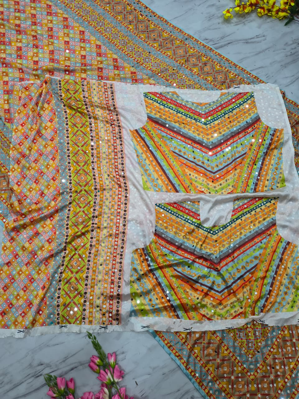 Blouse : Premium Chinon Silk With Beautiful Print And With Beautiful Real Mirror Work All Over( Unstiched )