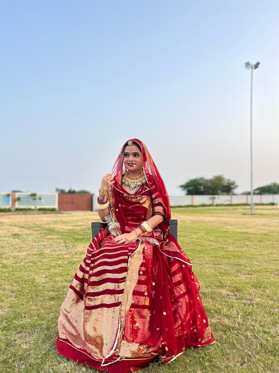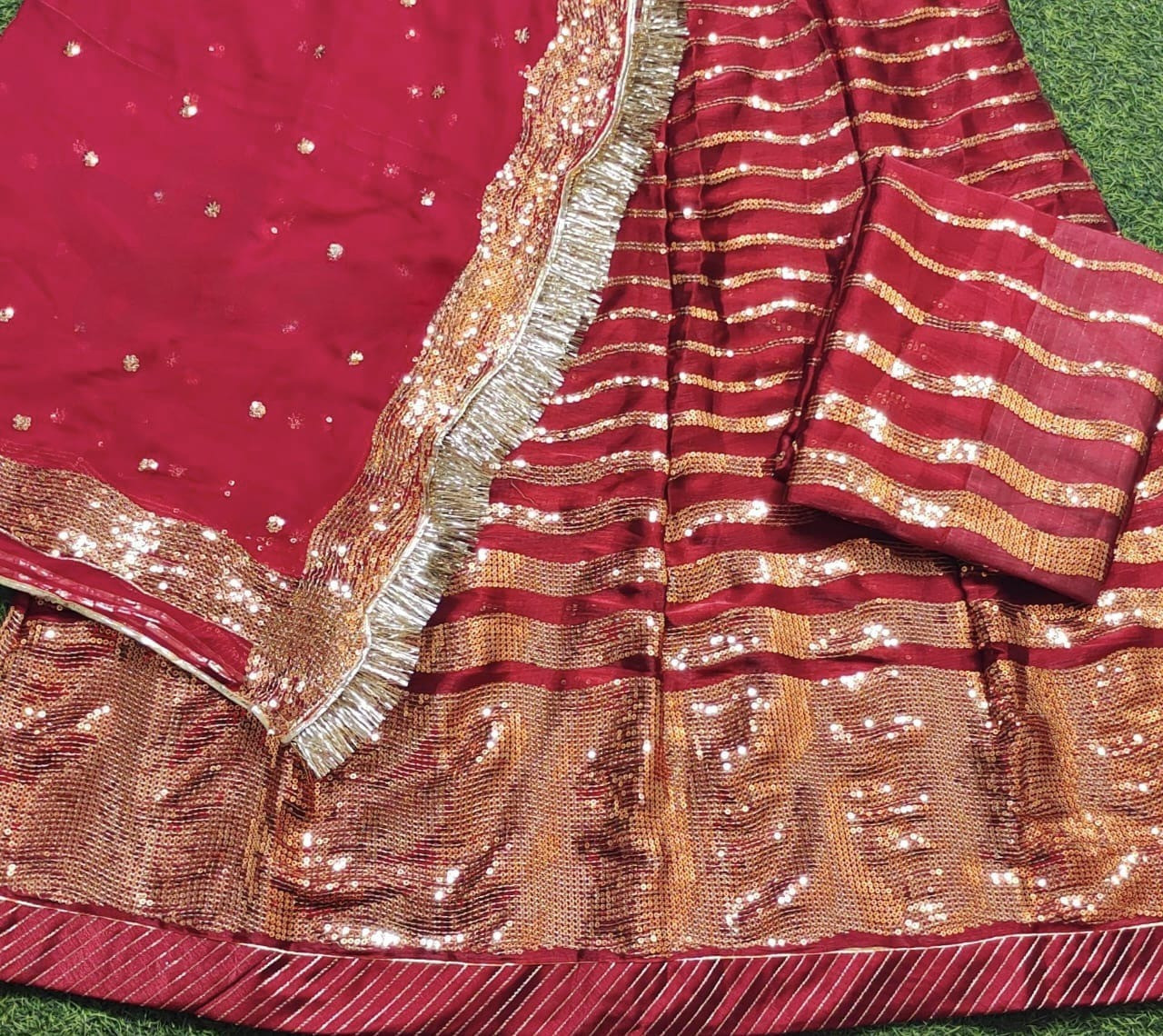 Celebrate Karwa Chauth in regal elegance with our Red Karwa Chauth Special Rajputi Poshak, crafted from premium heavy dark tissue fabric for a luxurious drape. The poshak features intricate heavy copper sequence work that shimmers beautifully, adding a touch of festive glamour. Paired with a premium hamrahi pure odhna adorned with gota kiran finishing, this outfit perfectly blends traditional craftsmanship with royal charm. Ideal for making your celebration truly memorable.
